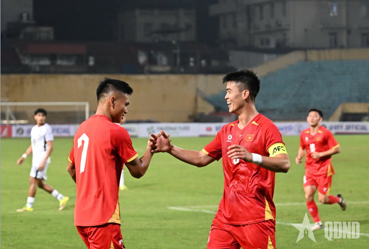 Xuân Mạnh (số 7) mừng bàn thắng vào lưới đội tuyển Bangladesh.