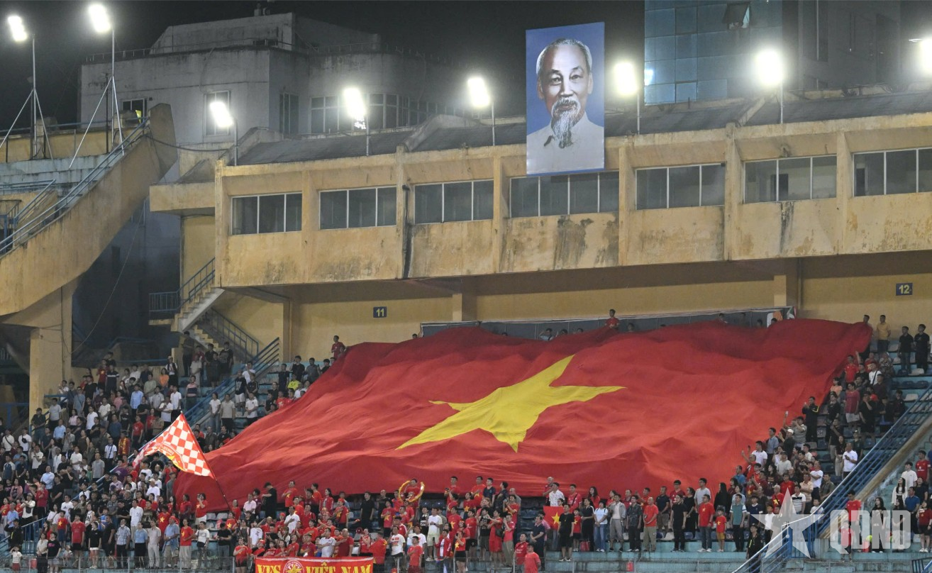 Đại kỳ trên khán đài sân Hàng Đẫy tiếp sức cho đội tuyển Việt Nam.