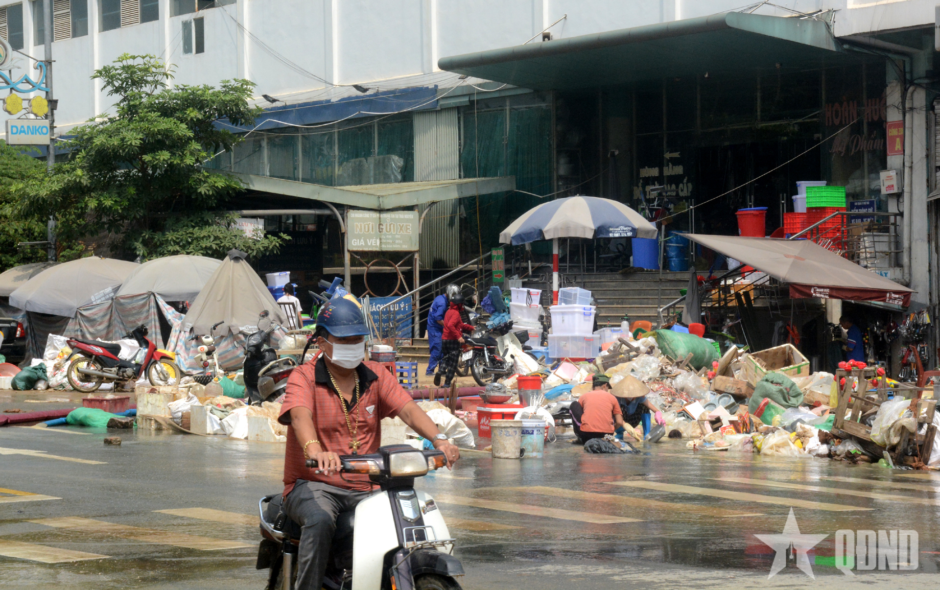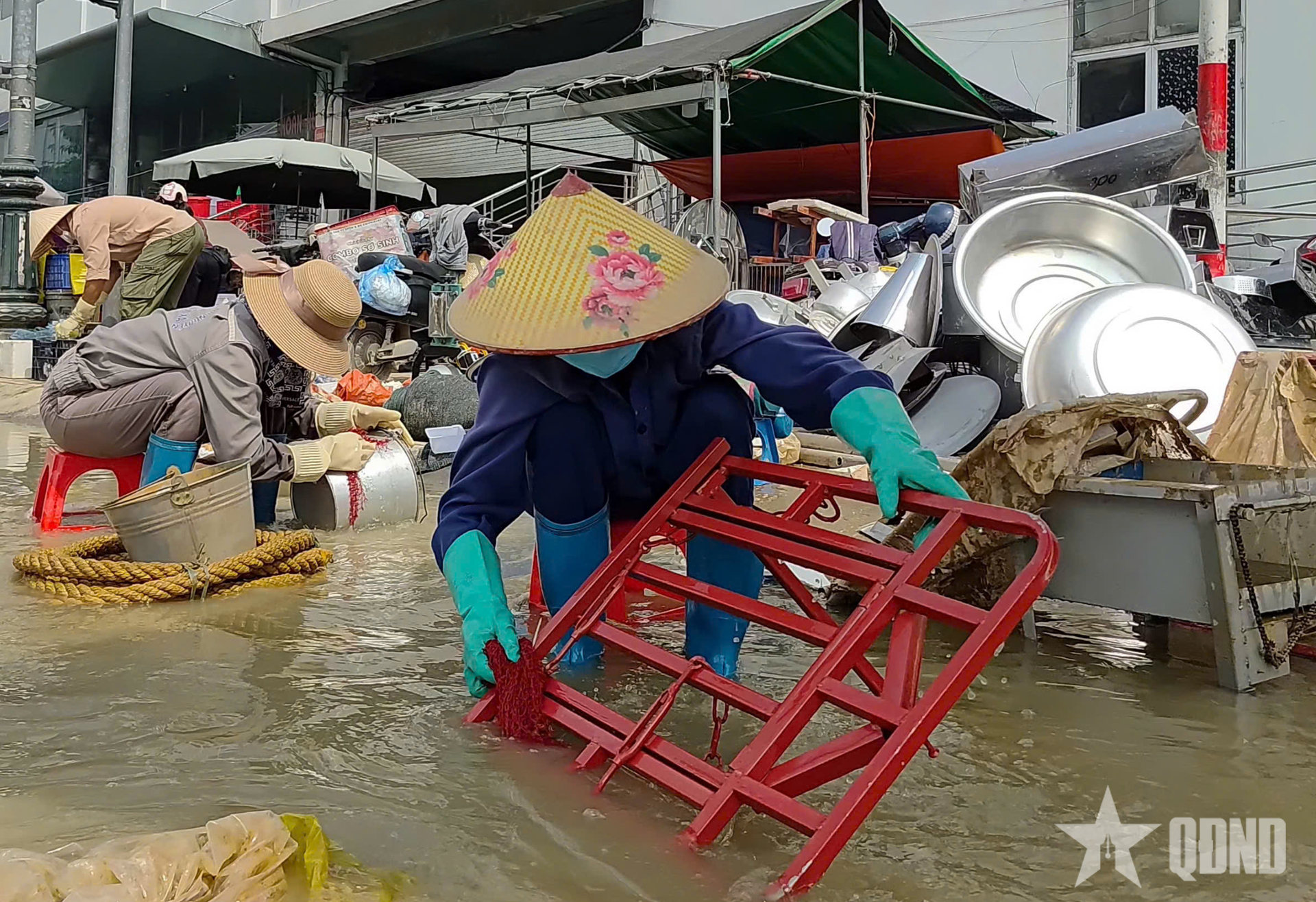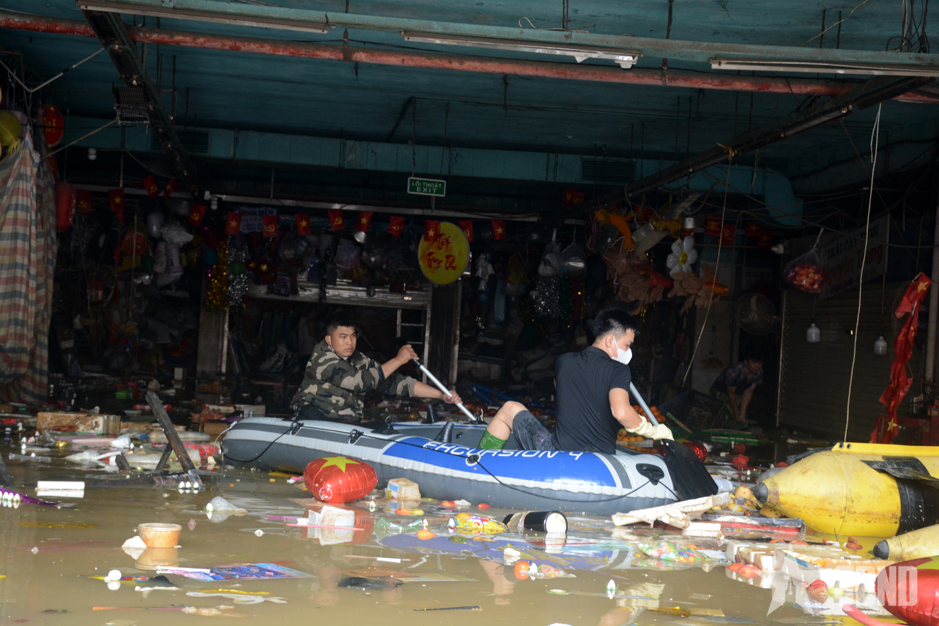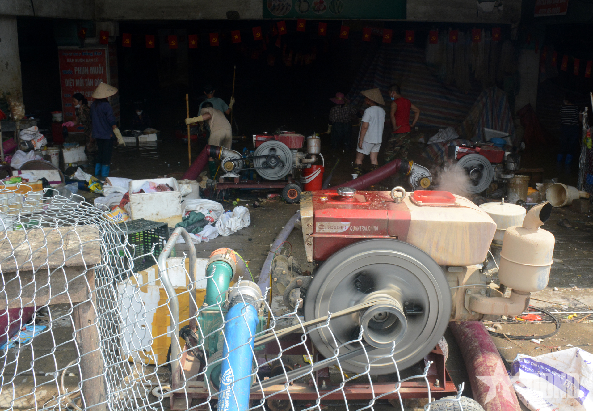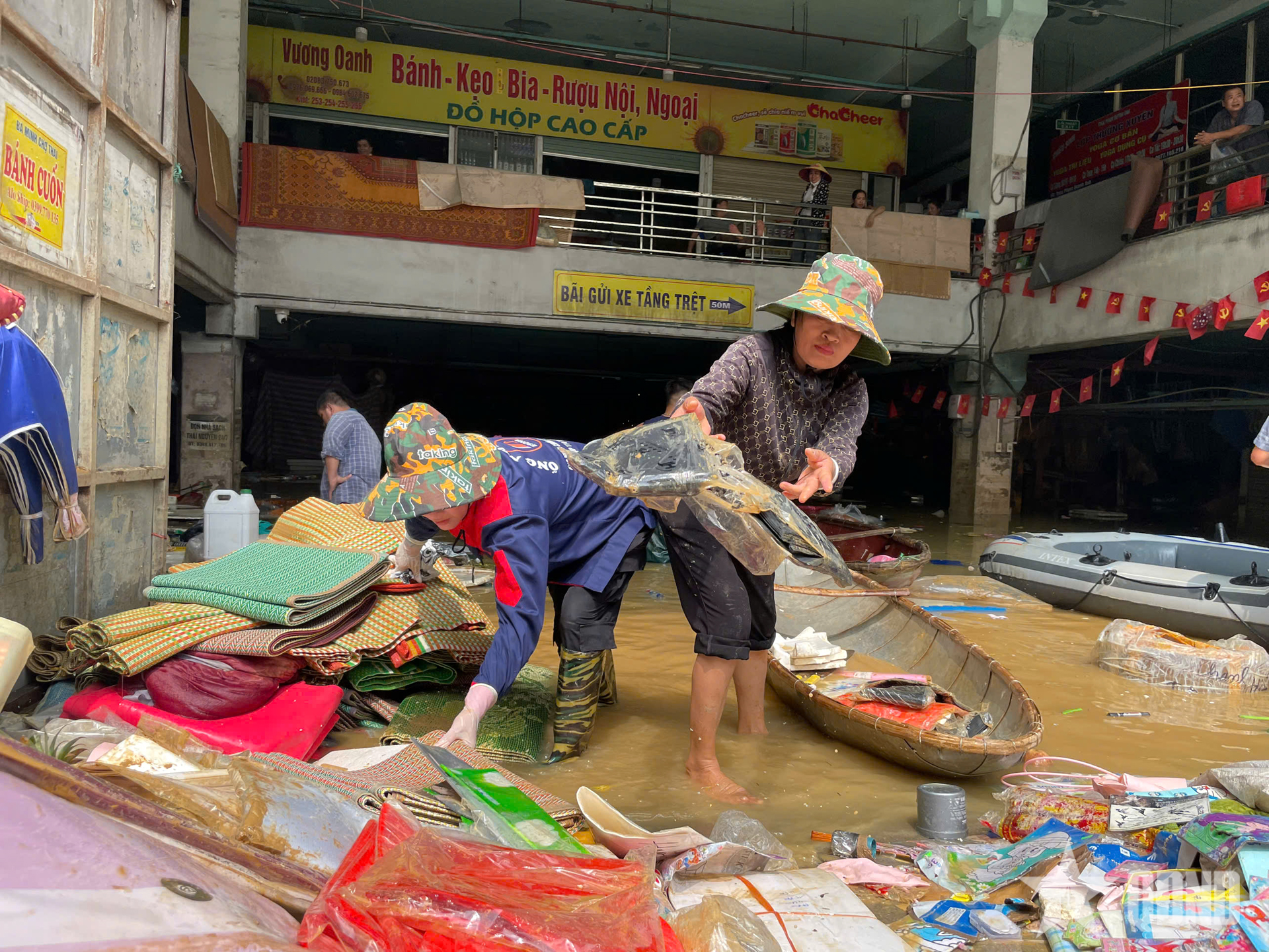 Các tiểu thương vẫn bì bõm dưới tầng hầm mò mẫm, vận chuyển đồ ra ngoài và tận dụng nguồn nước bơm lên để rửa đồ, cố vớt vát tài sản. Cái nắng gay gắt và mùi nước lũ bốc lên khiến khung cảnh ở chợ Thái càng thêm cám cảnh. Ở tầng 1 của chợ, các tiểu thương nhìn xuống tầng hầm với ánh mắt thẫn thờ, vô vọng. Tất cả hàng hóa của họ đã bị mất trắng, tài sản tích góp bao năm cũng trôi theo nước lũ.
