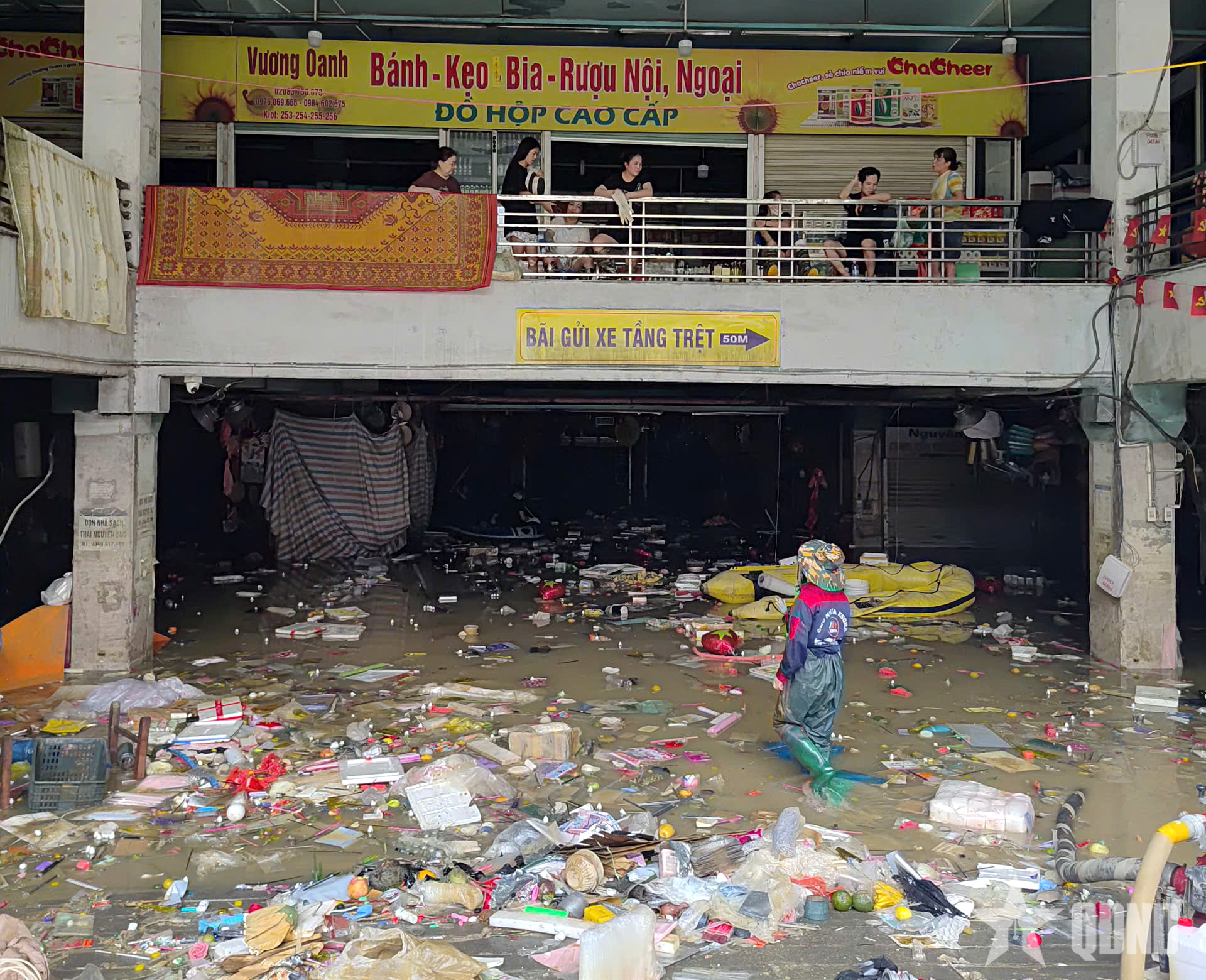 Hàng hóa, rác nổi lềnh bềnh trong tầng hầm trước những ánh mắt thẫn thờ của tiểu thương.