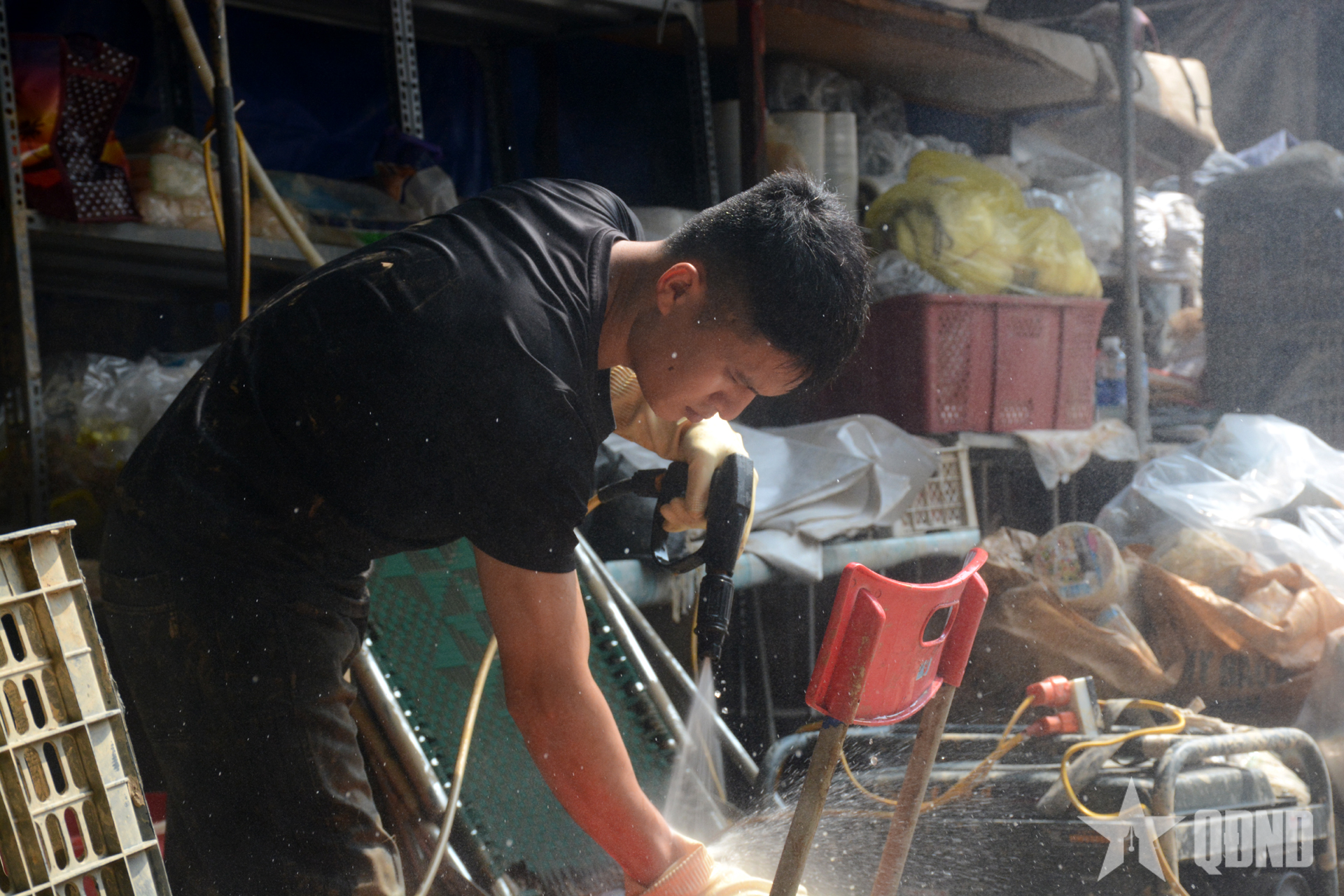 Tiểu thương lau rửa hàng hóa còn dùng được.