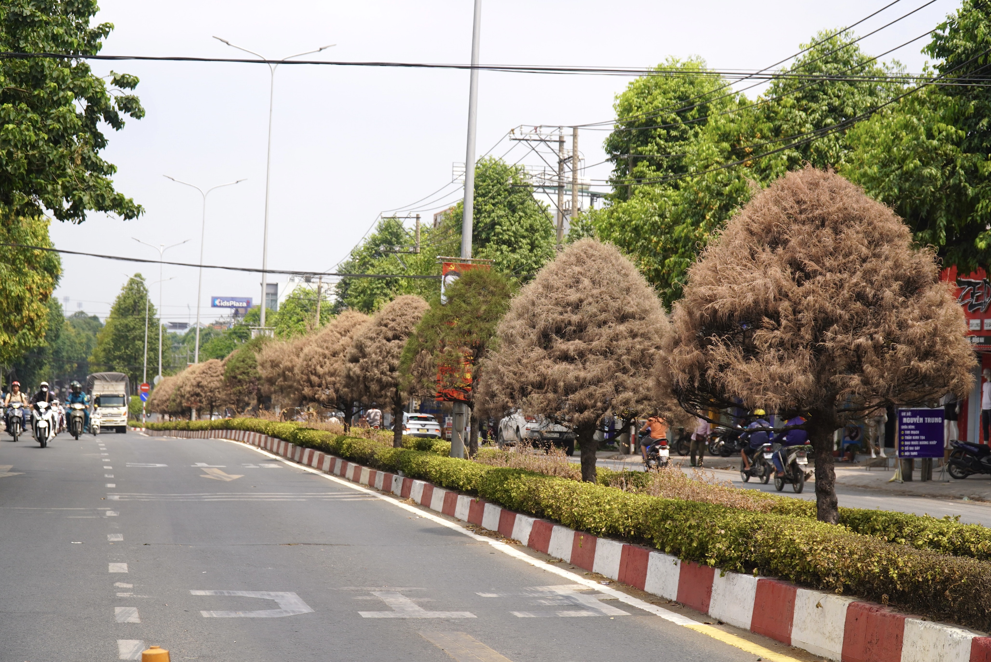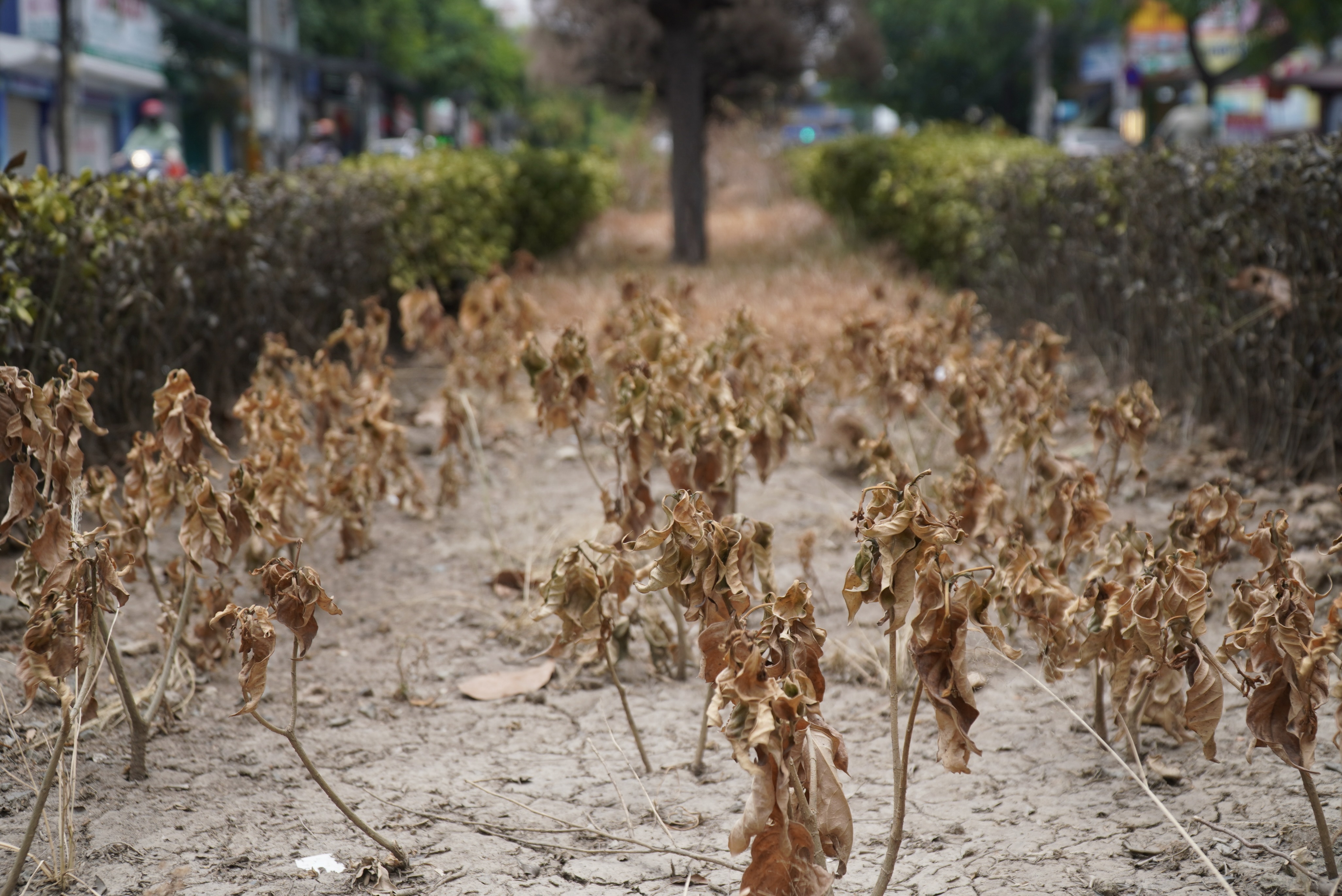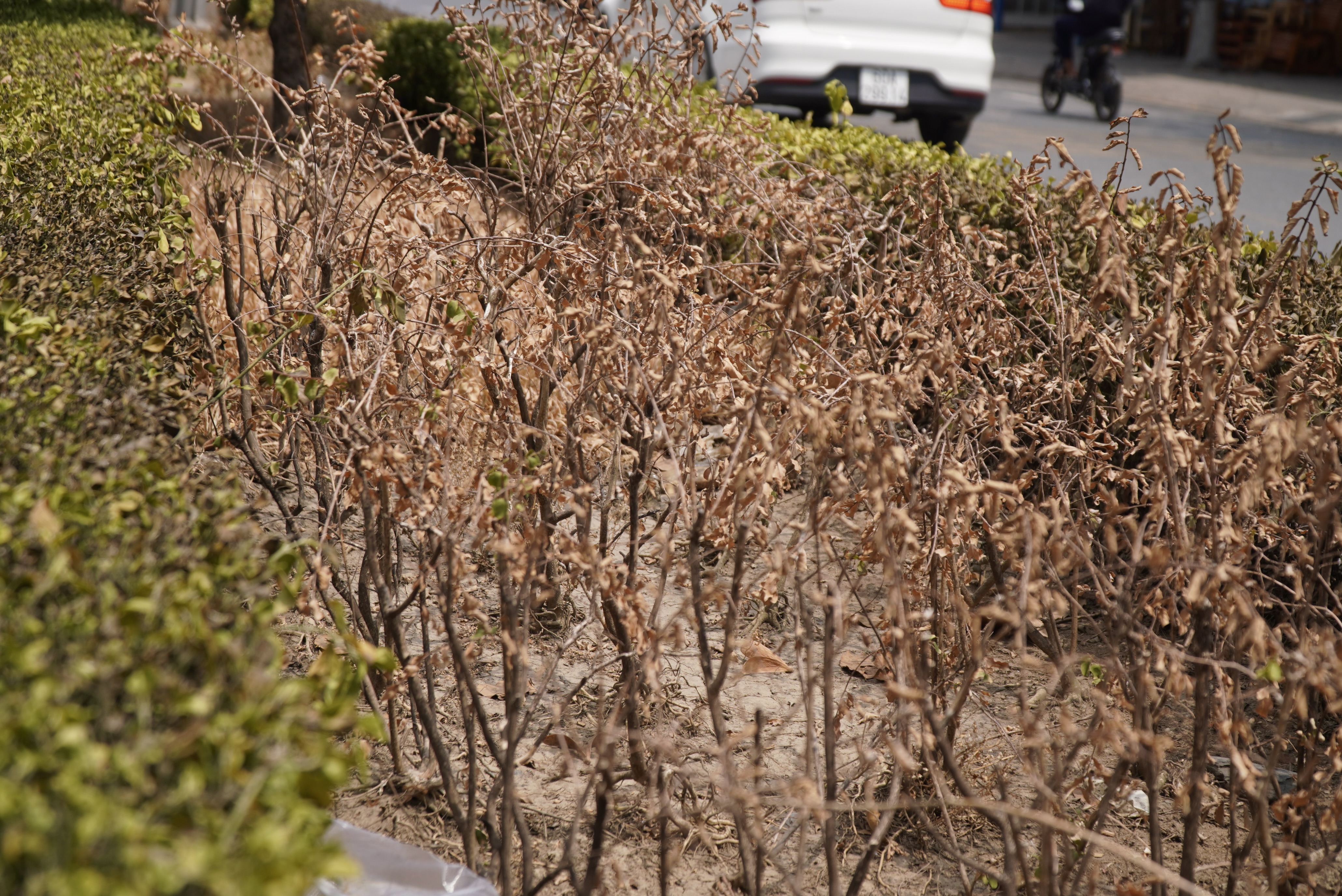 Hàng cây xanh nhỏ bao quanh dải phân cách cũng héo khô.