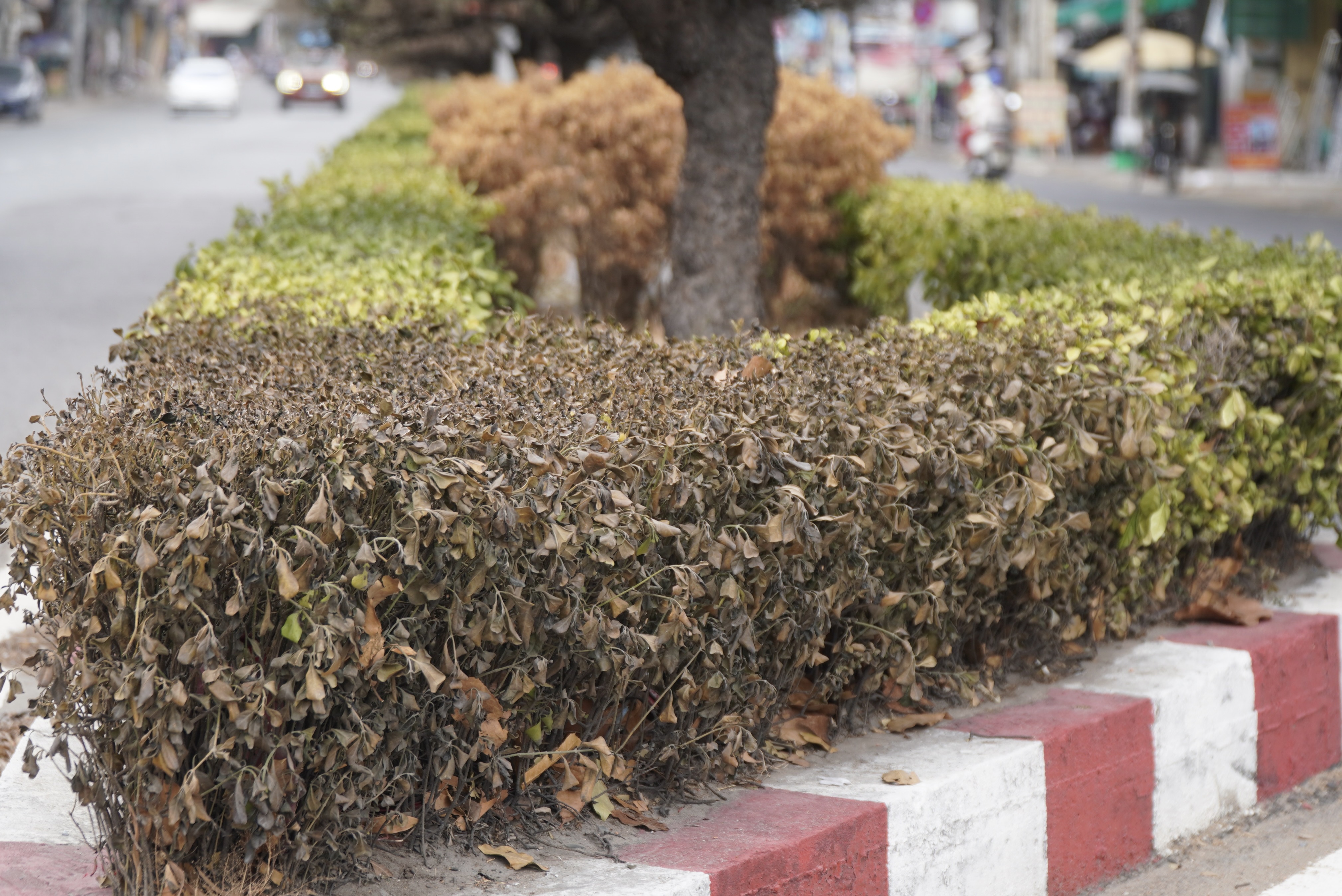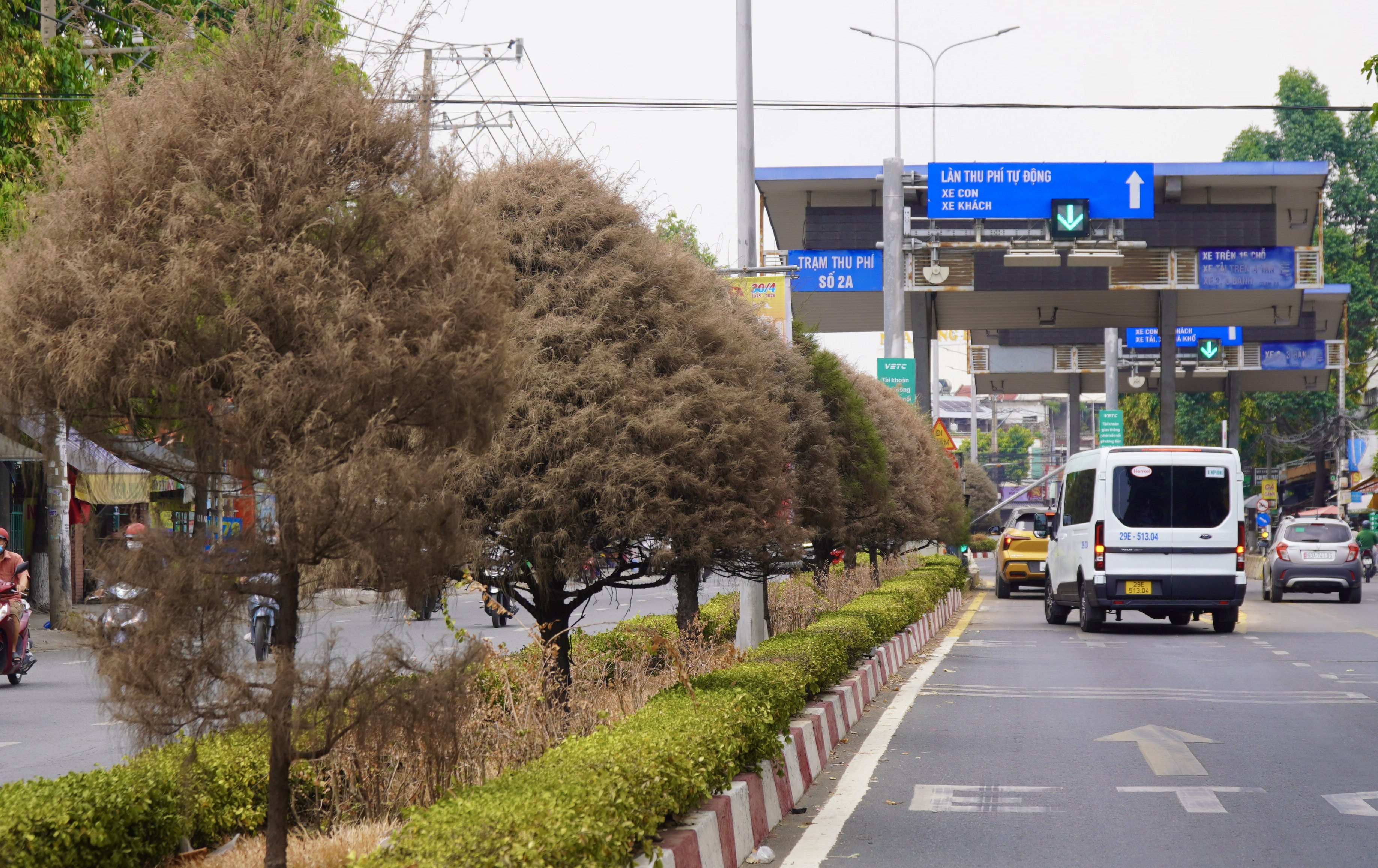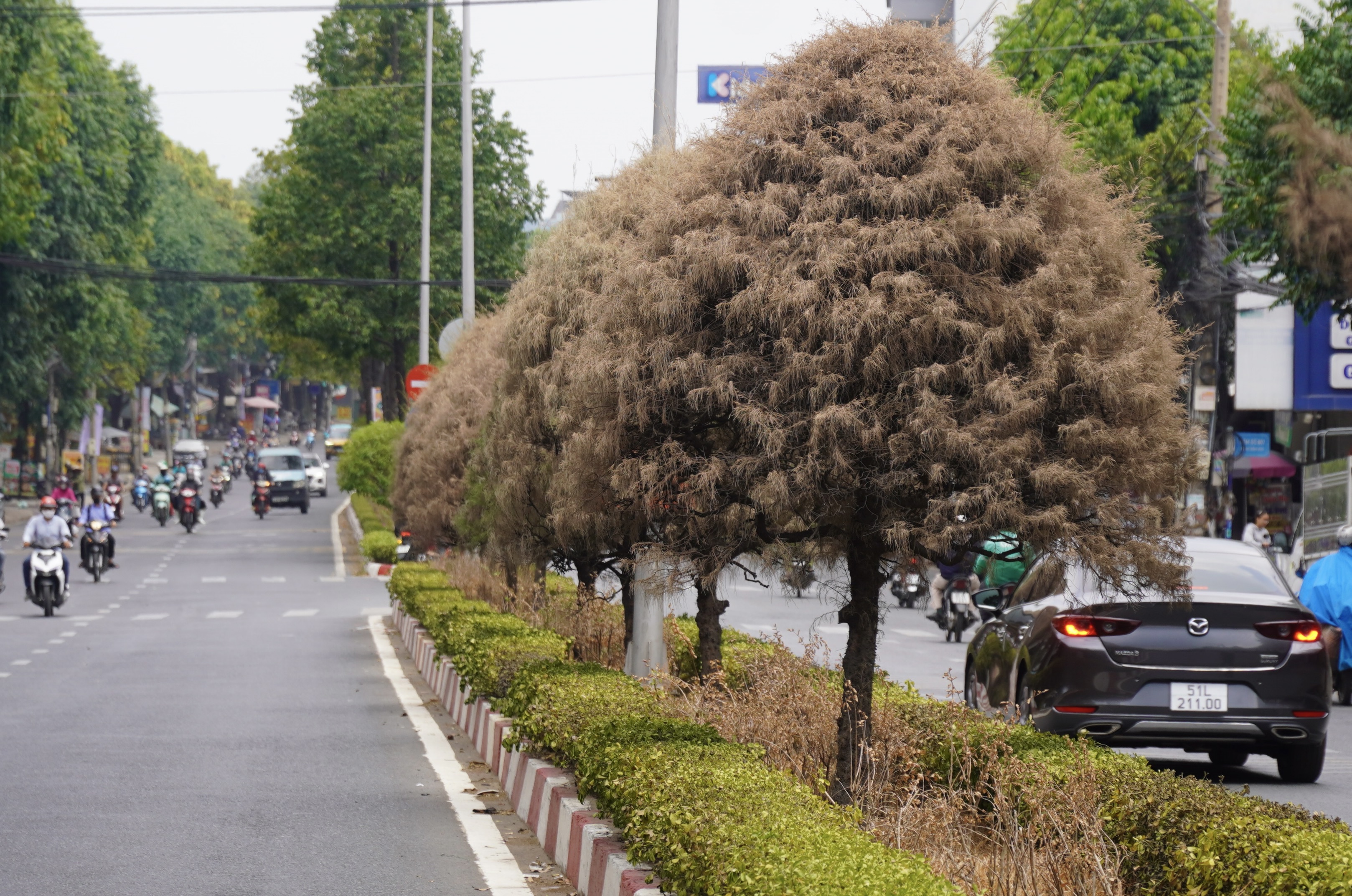 Hàng cây xanh nhỏ bao quanh dải phân cách cũng héo khô.