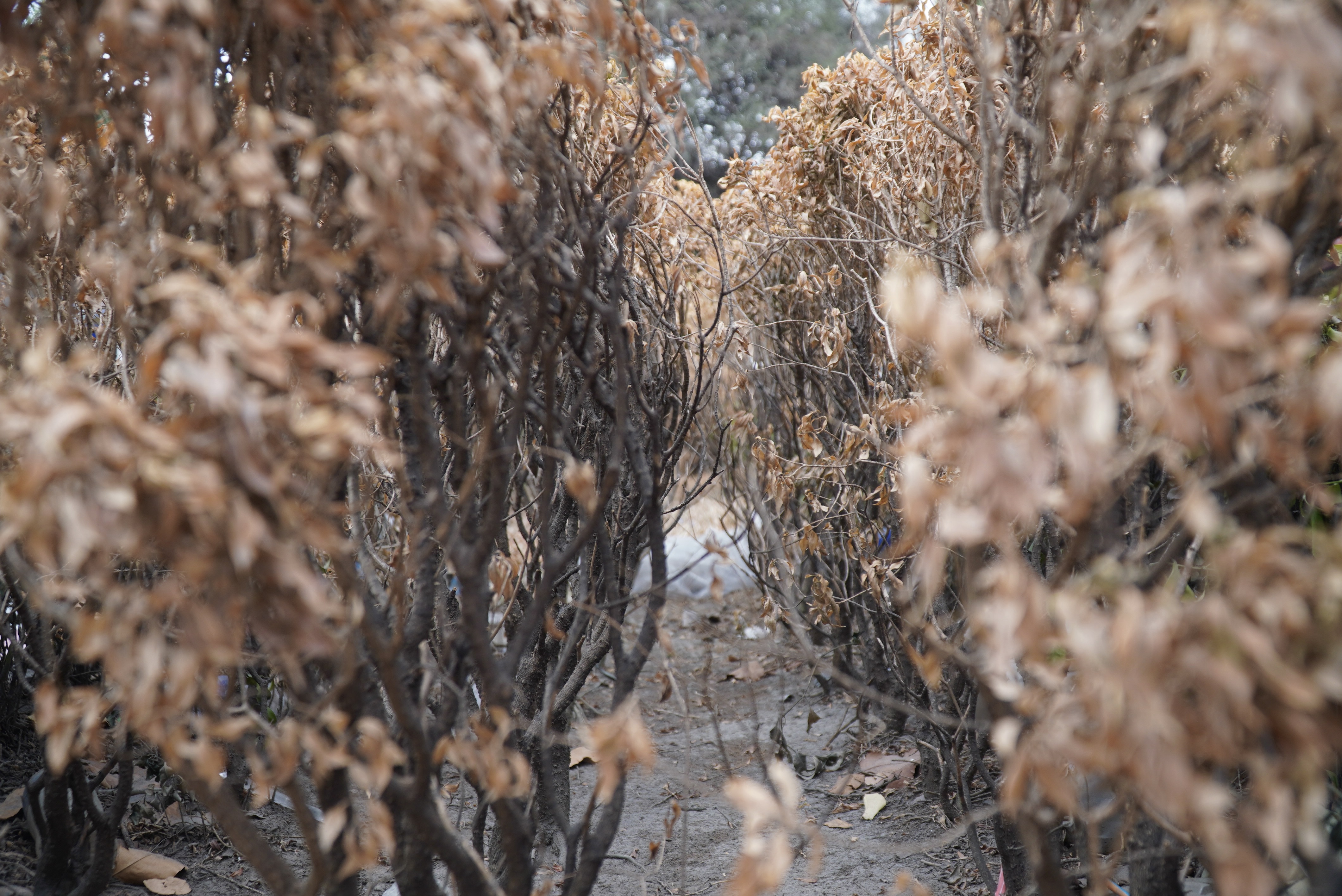 Bên cạnh cây Tùng Dương, những bụi cây hoa nhỏ được trồng xen kỹ cũng đã héo.