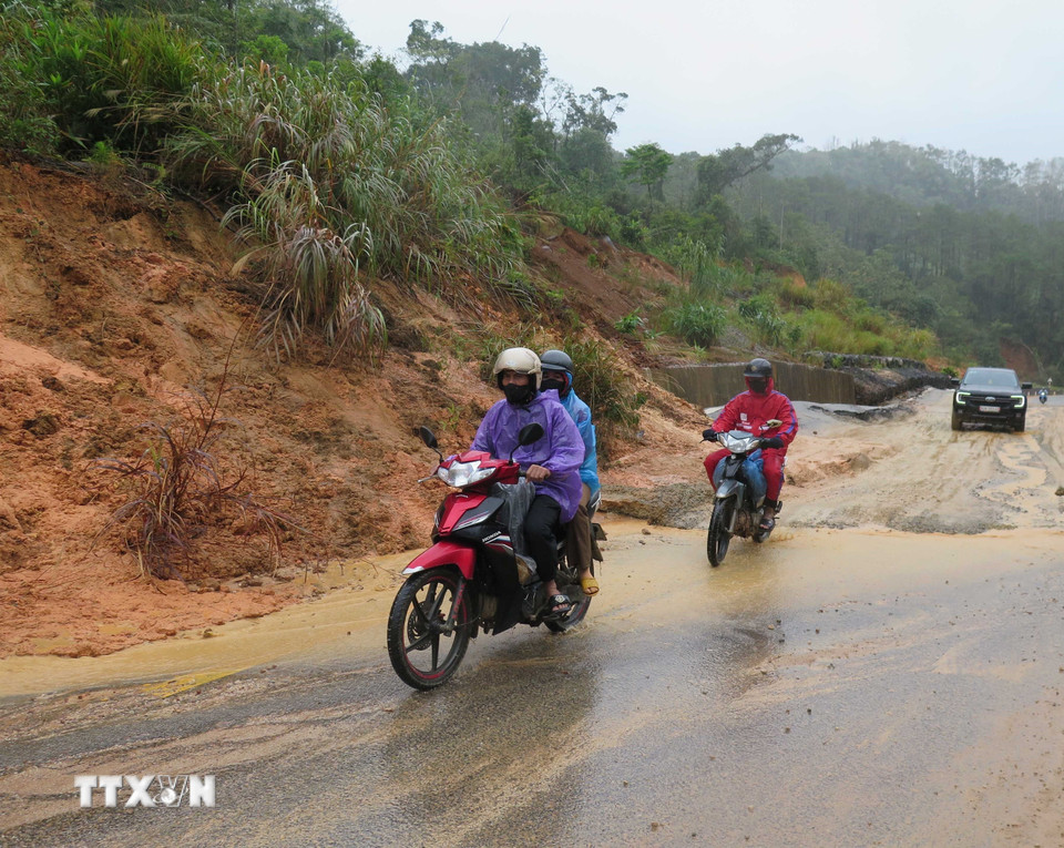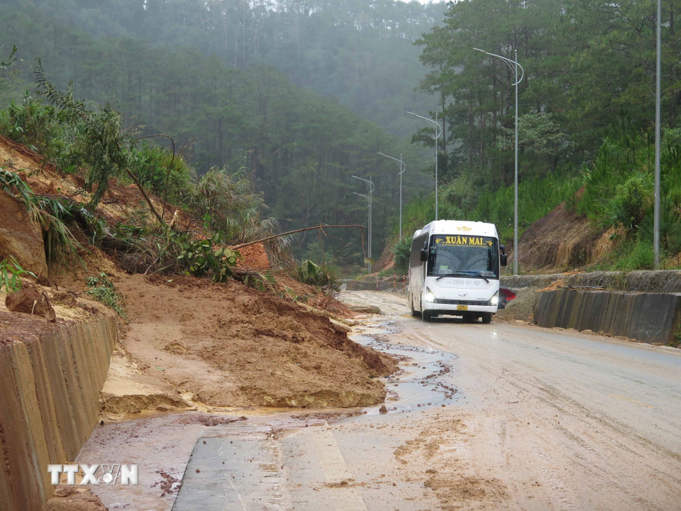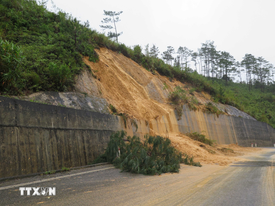 Hàng chục điểm sạt lở trên tuyến Quốc lộ 24 gây nguy hiểm cho các phương tiện giao thông. (Ảnh: Dư Toán/TTXVN)