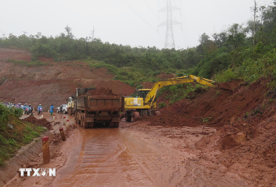 Lực lượng chức năng đang khẩn trương xử lý các điểm sạt lở trên Quốc lộ 24. (Ảnh: Dư Toán/TTXVN)