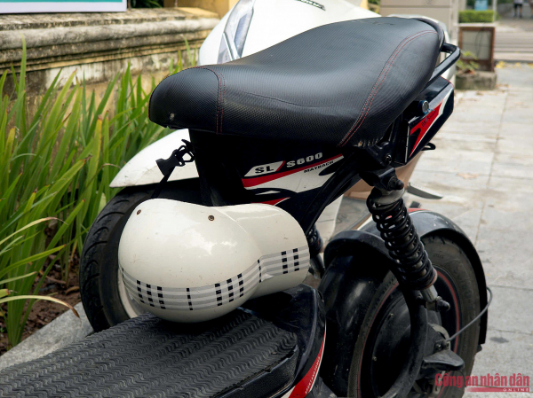 Chiếc mũ bảo hiểm của một em học sinh được treo ở yên xe máy trong suốt quá trình lưu thông trên đường thay vì đội lên đầu.