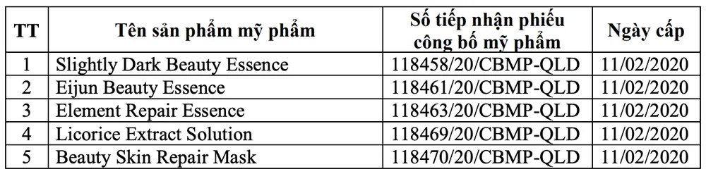 Mẫu mỹ phẩm trên do Trung tâm Kiểm nghiệm thuốc, mỹ phẩm, thực phẩm - Sở Y tế Hà Nội lấy mẫu tại quầy thuốc Minh Ngọc (xã Đông Anh, Hà Nội) để kiểm tra chất lượng. Lô sản phẩm được sản xuất sau khi hết hạn số tiếp nhận phiếu công bố sản phẩm mỹ phẩm, đồng thời nhãn sản phẩm ghi công dụng không phù hợp với sản phẩm mỹ phẩm.