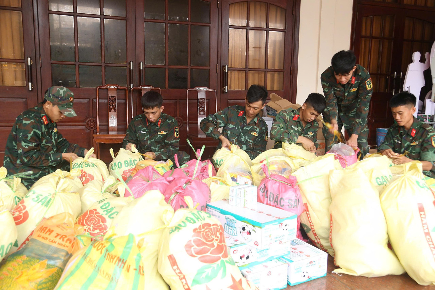 Cán bộ chiến sĩ chuẩn bị các phần quà, nhu yếu phẩm ứng cứu đồng bào vùng ngập sâu.