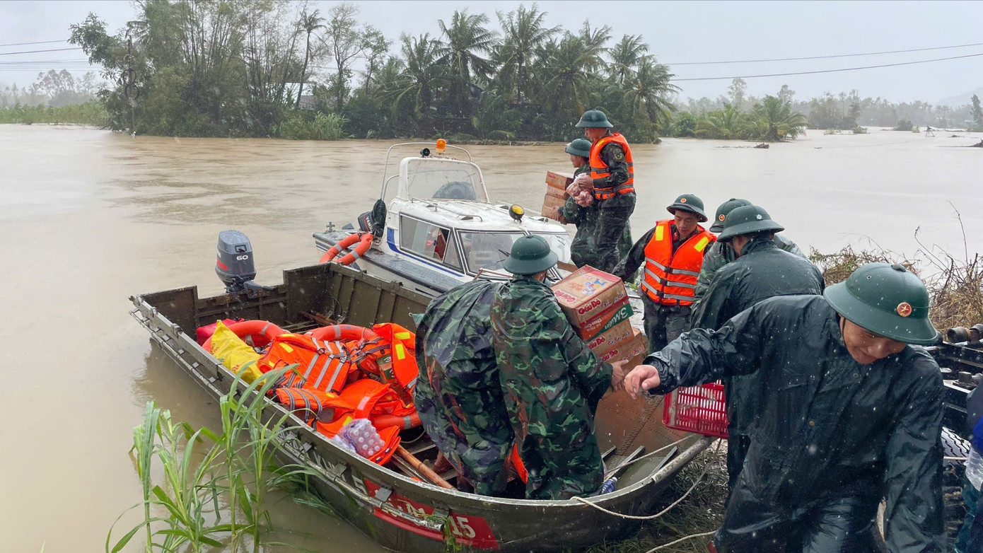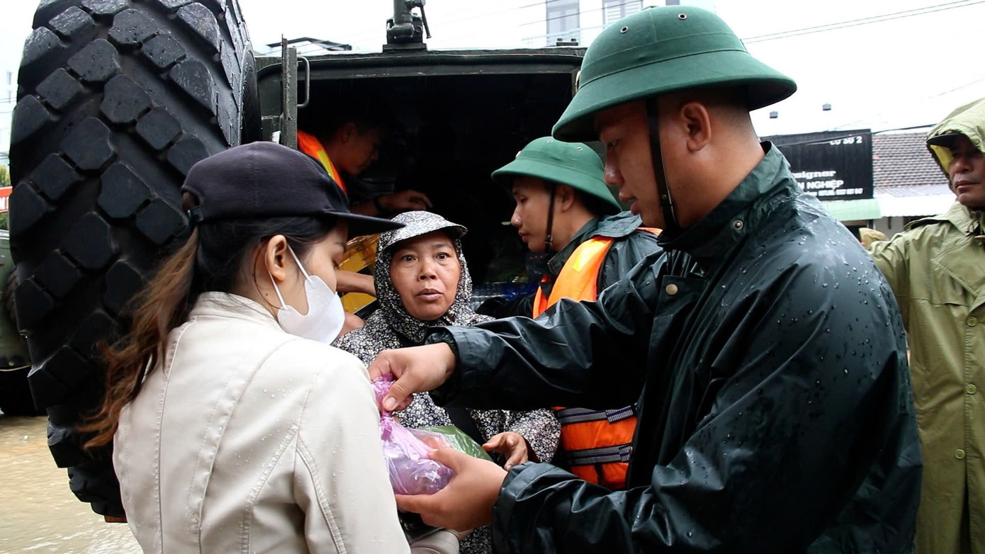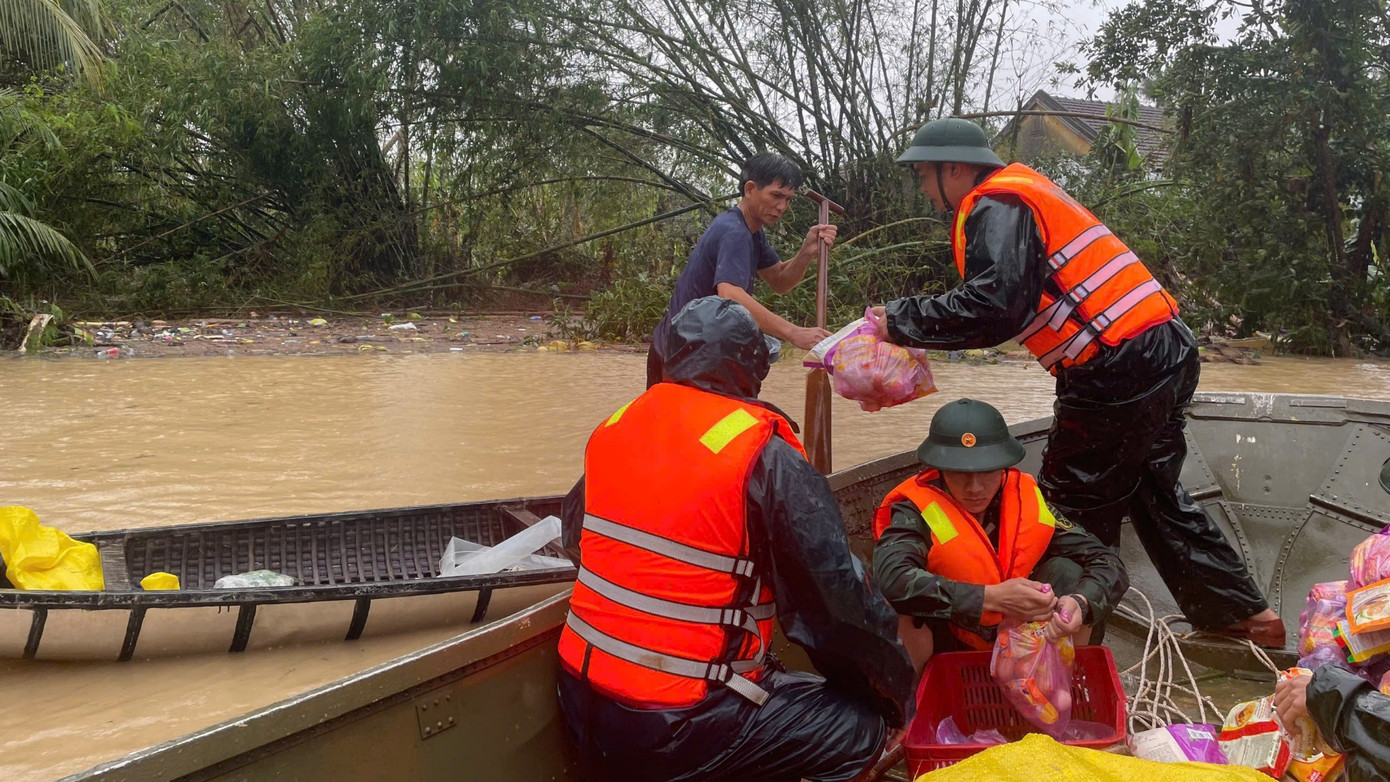 Tiếp tế nhu yếu phẩm cho người dân trên vùng lũ ở xã Tuy An Bắc, tỉnh Đắk Lắk.