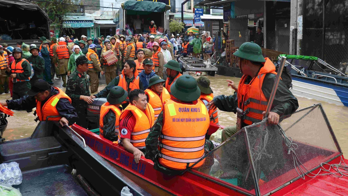 Trong ngày, các đơn vị Quân khu 5 phối hợp với công an và lực lượng địa phương hỗ trợ hàng nghìn suất ăn, nước đóng chai giúp đồng bào các phường Quy Nhơn Đông, Quy Nhơn Bắc, xã Tuy Phước và một số vùng bị ngập ở Gia Lai. Đồng thời, phối hợp giúp cấp ủy, chính quyền, Nhân dân địa phương khắc phục hậu quả theo tinh thần nước rút đến đâu khắc phục đến đó.