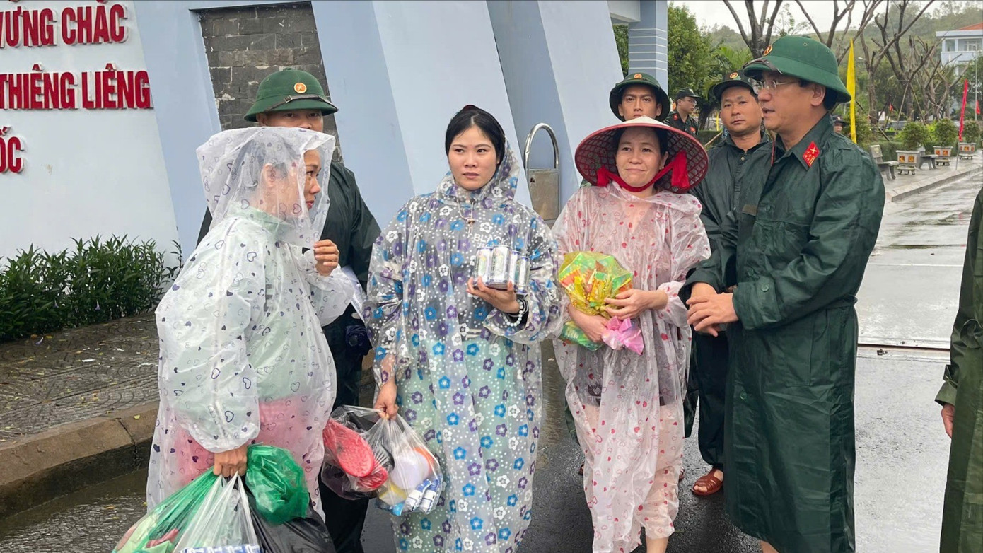 Đại tá Phan Đại Nghĩa cùng đoàn công tác cũng đã đến thăm hỏi tặng quà kịp thời động viên bà con nhân dân thôn Thượng Phú, phường Bình Kiến đang trú tránh tại Lữ đoàn TLB 682, Quân chủng Hải quân.