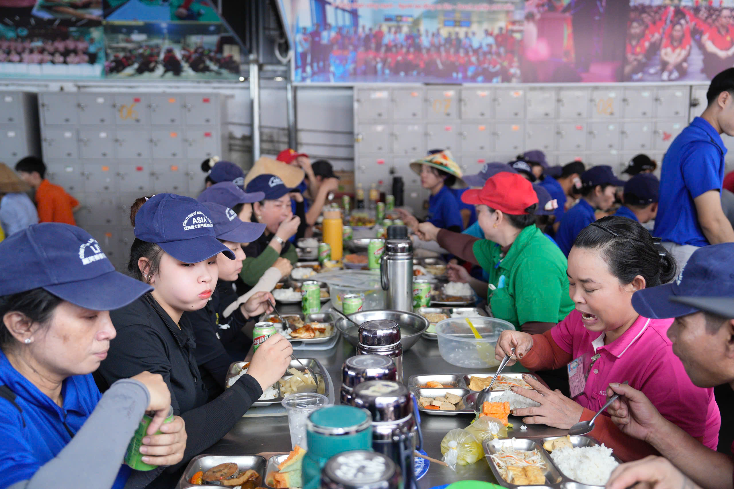Đúng 11 giờ 30 phút, người lao động nghỉ giữa ca cùng xuống nhà ăn, quây quần bên nhau thưởng thức "Bữa cơm đại đoàn kết dân tộc".
