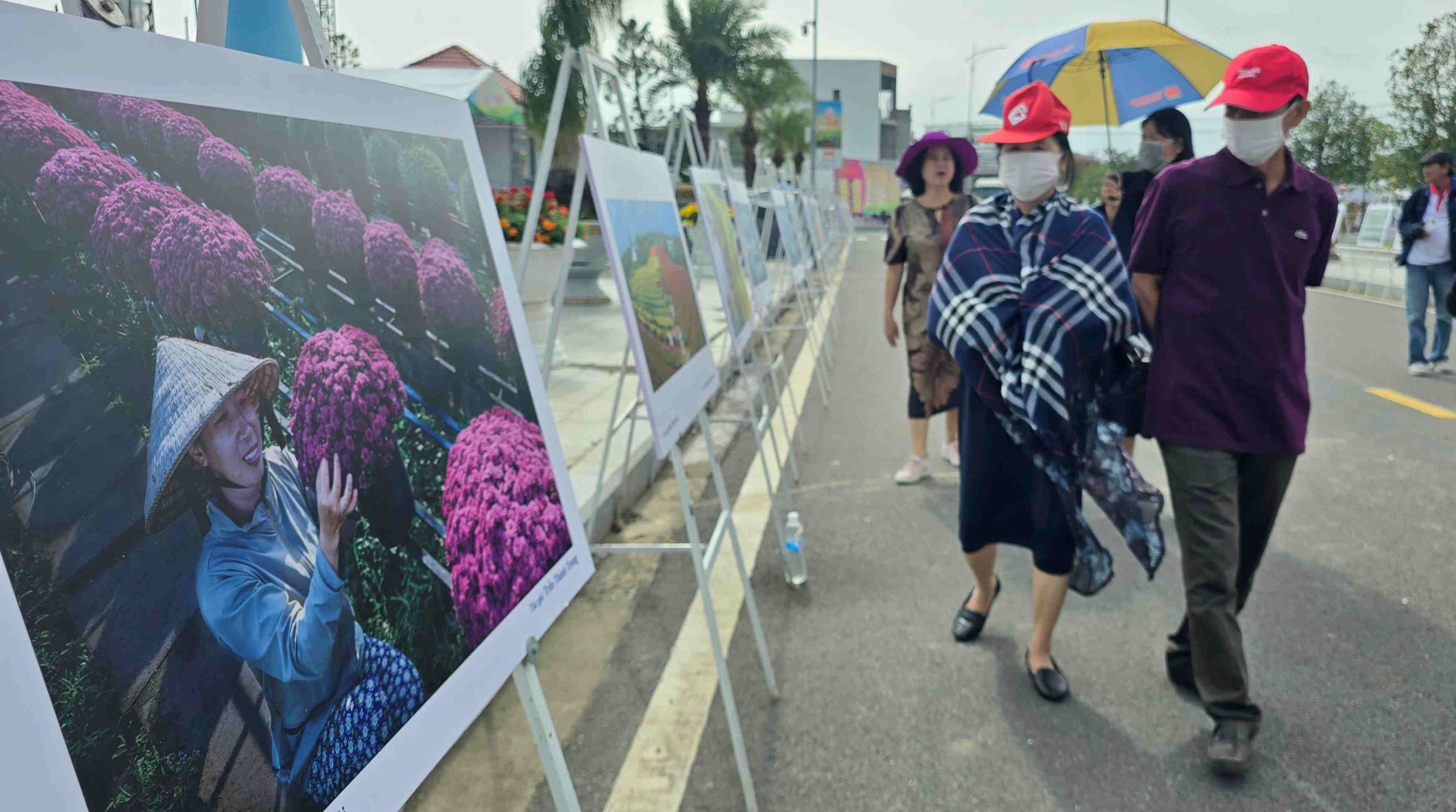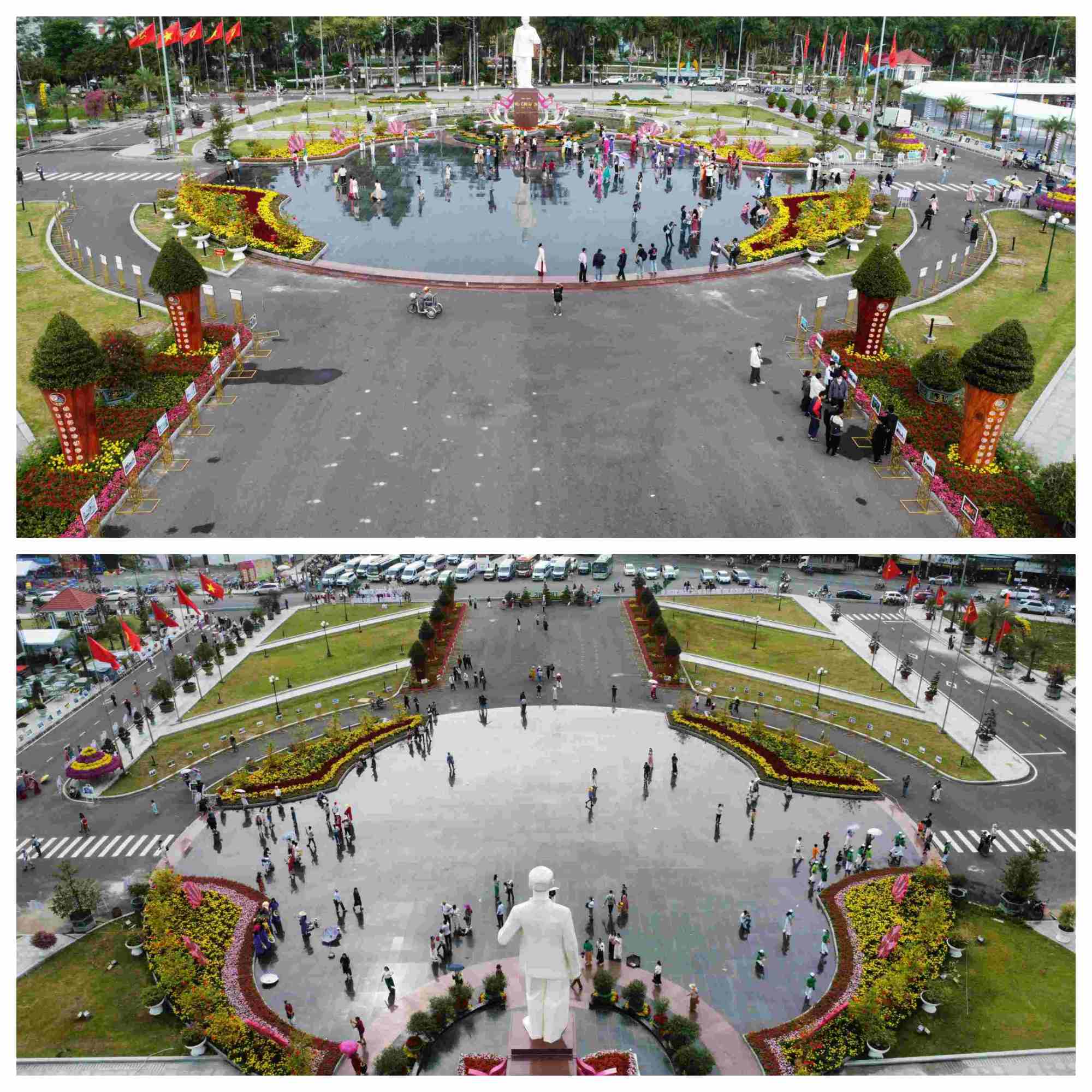Du khách chụp hình bên không gian hoa được thiết kế đẹp mắt tại quảng trường Sa Đéc