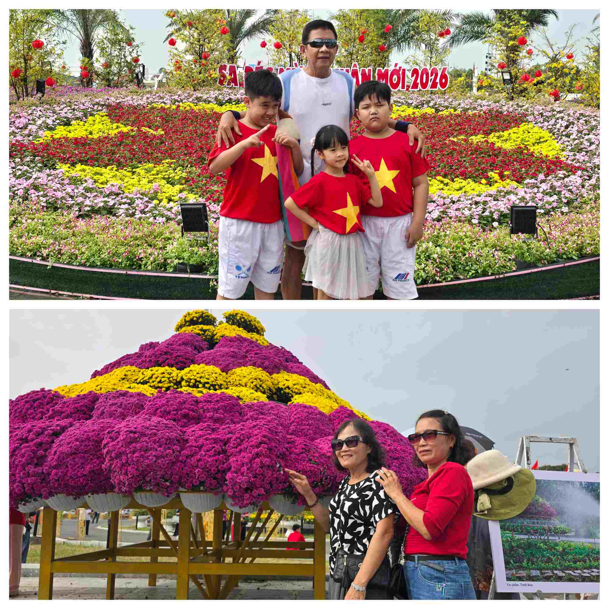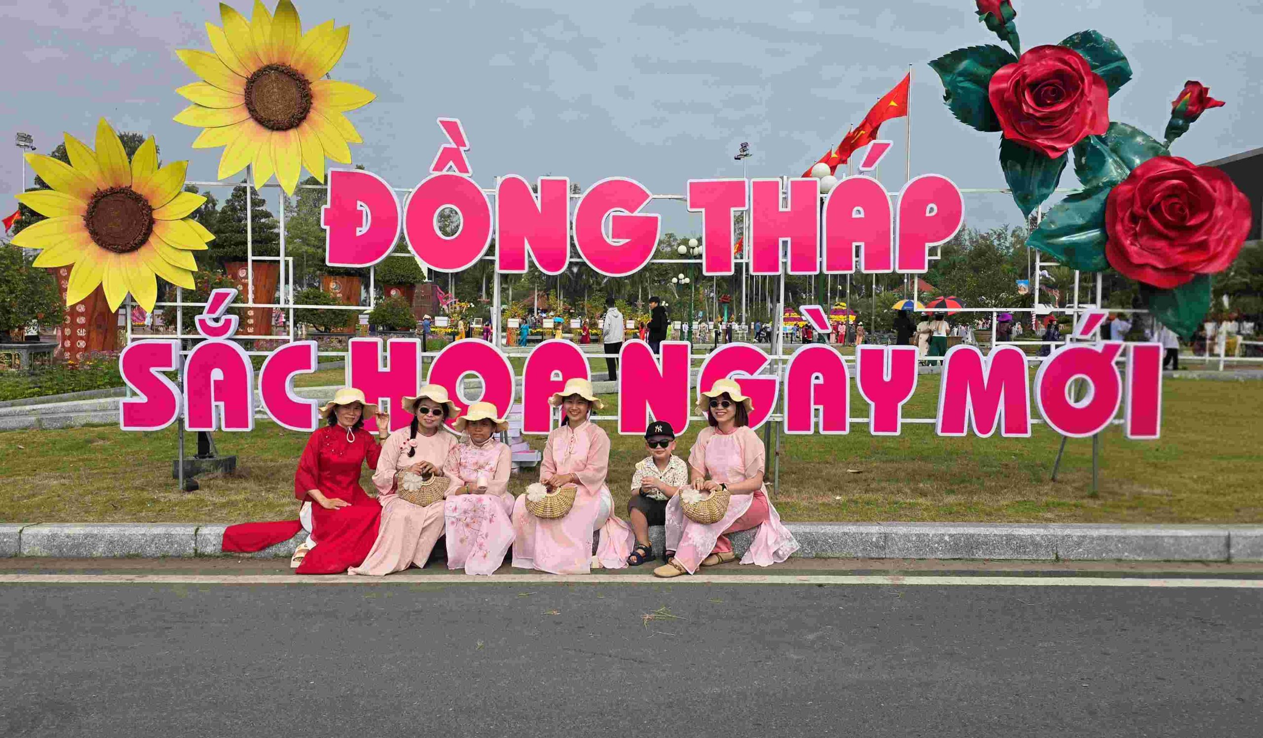 Gia đình của một du khách đến từ tỉnh Vĩnh Long chụp ảnh lưu niệm bên dòng chữ “Sắc hoa ngày mới” - chủ đề Festival hoa kiểng Sa Đéc lần thứ II năm 2025.