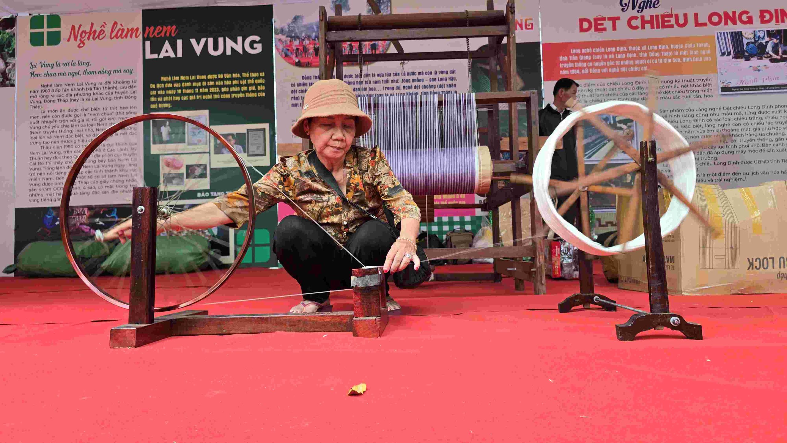 Bà Nguyễn Thị Bé, một nghệ nhân dệt choàng (khăn rằn) của làng nghề dệt choàng Long Khánh, xã Long Khánh, tỉnh Đồng Tháp đang thực hiện công đoạn đầu tiên, tức công đoạn “chỉ quay vô ống” của quy trình dệt choàng.
