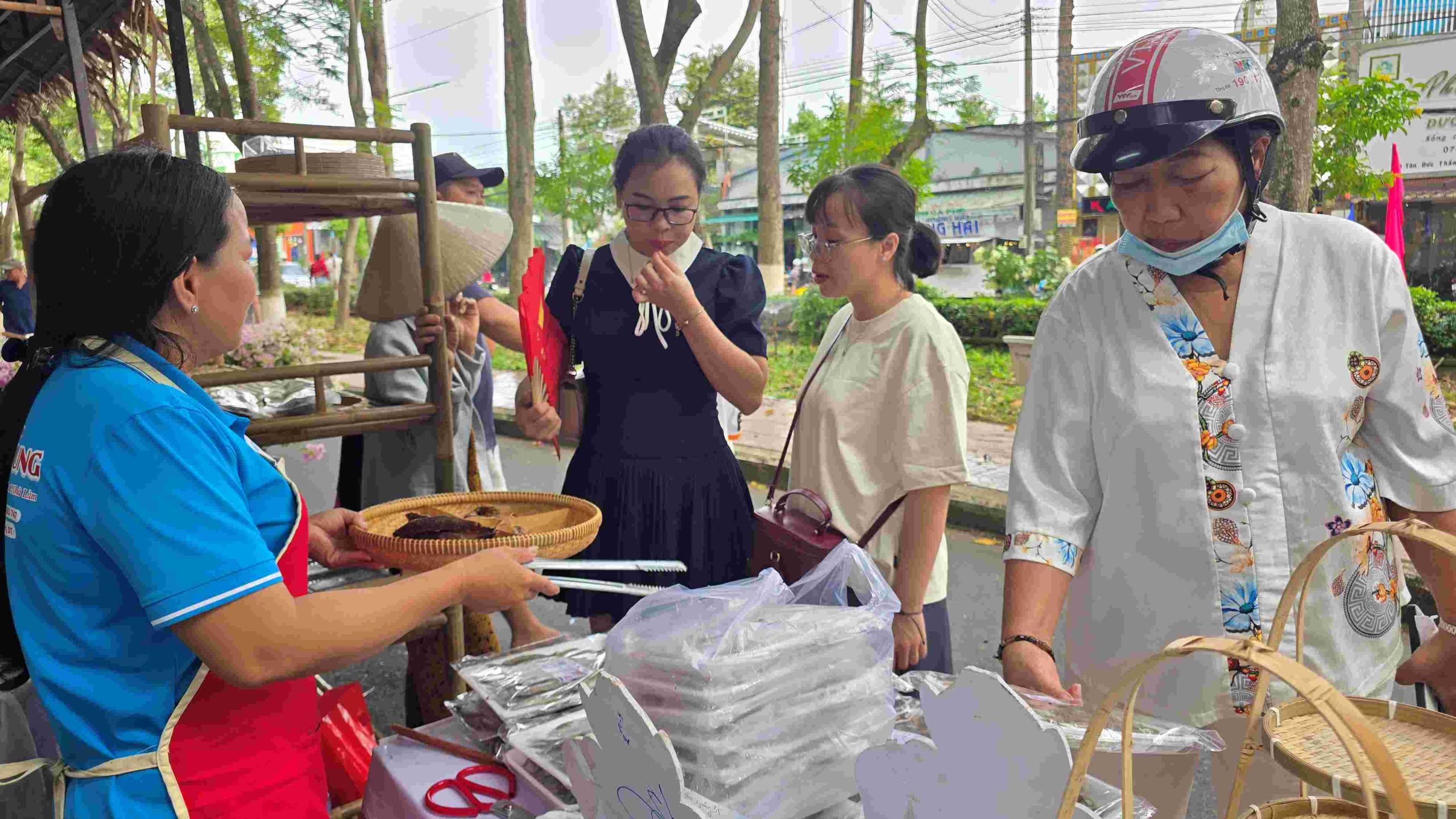 Du khách tham quan, mua sắm tại không gian triển lãm, trưng bày sản phẩm OCOP (sản phẩm của chương trình mỗi xã một sản phẩm), sản phẩm đặc trưng vùng Đồng bằng sông Cửu Long.