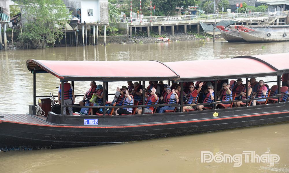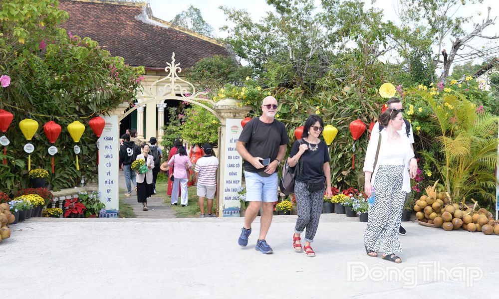 Du khách quốc tế đi tàu đến tham quan Làng cổ Đông Hòa Hiệp trong những ngày diễn ra Lễ hội.