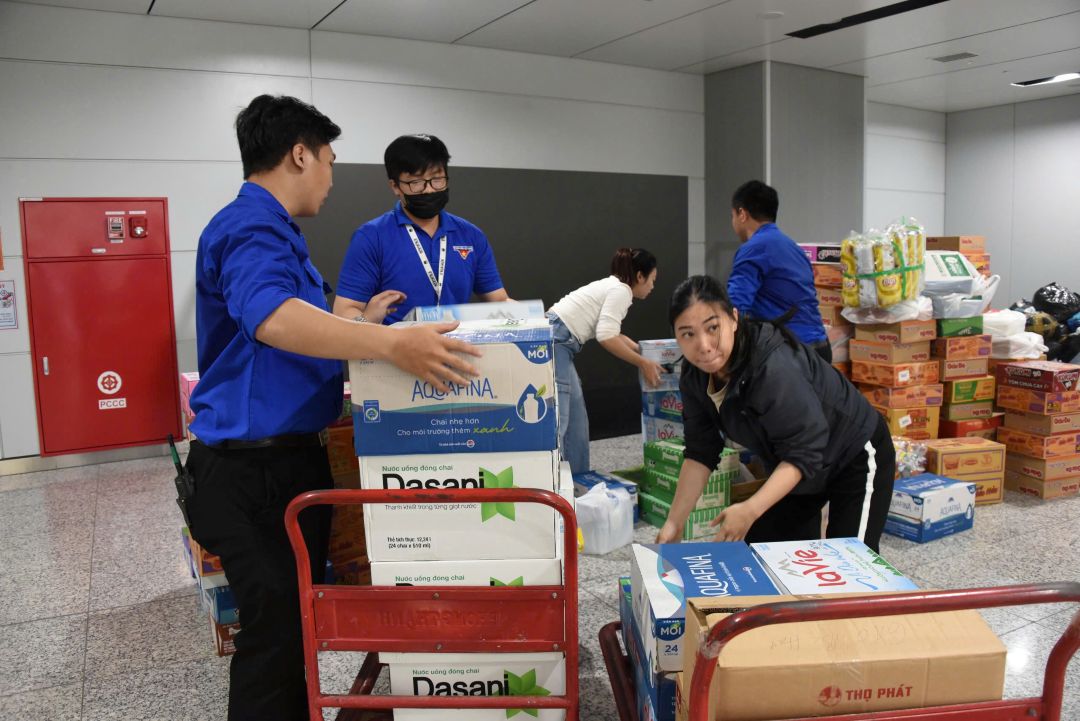 Nhân viên, tình nguyện viên tại nhà ga của tuyến metro số 1 liên tục tiếp nhận hàng hóa cứu trợ. Người dân có thể mang quần áo, đồ dùng thiết yếu đến gửi từ 5 giờ đến 22 giờ các ngày trong tuần và đến 23 giờ vào thứ Bảy, Chủ nhật.