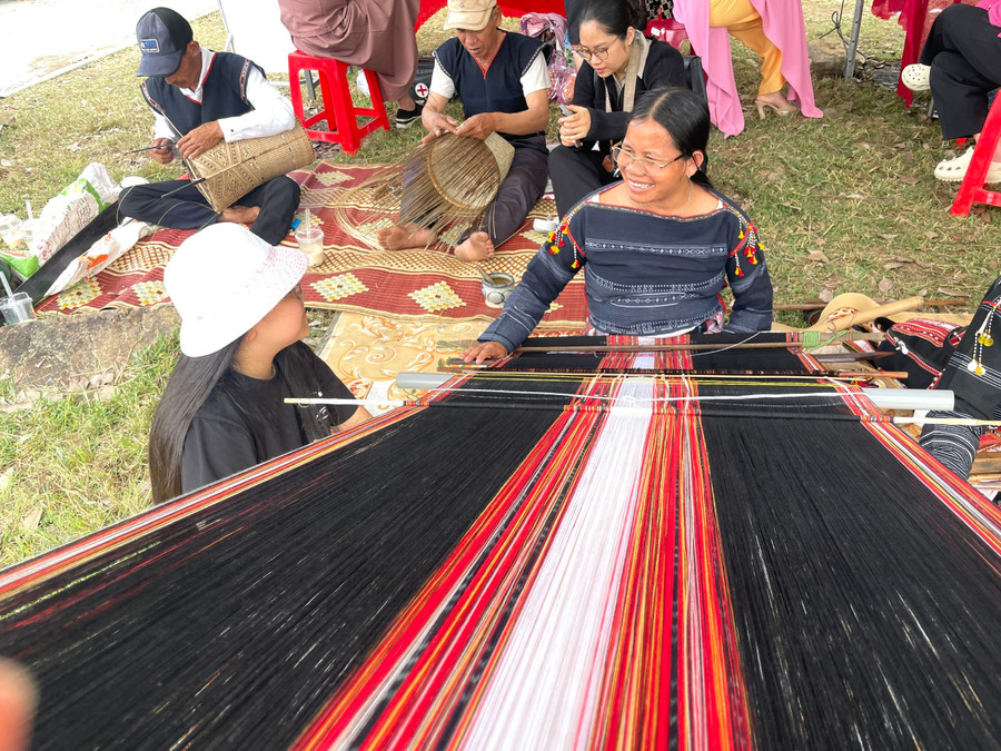 Nghệ nhân dệt thổ cẩm vui vẻ trò chuyện với khách trải nghiệm. Ảnh: Phương Duyên