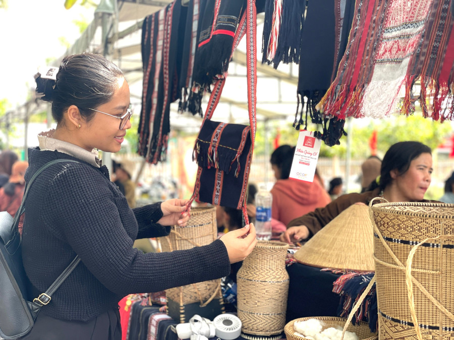 Các sản phẩm thủ công đẹp mắt của người dân làng Kgiang trưng bày tại một gian hàng. Ảnh: Phương Duyên