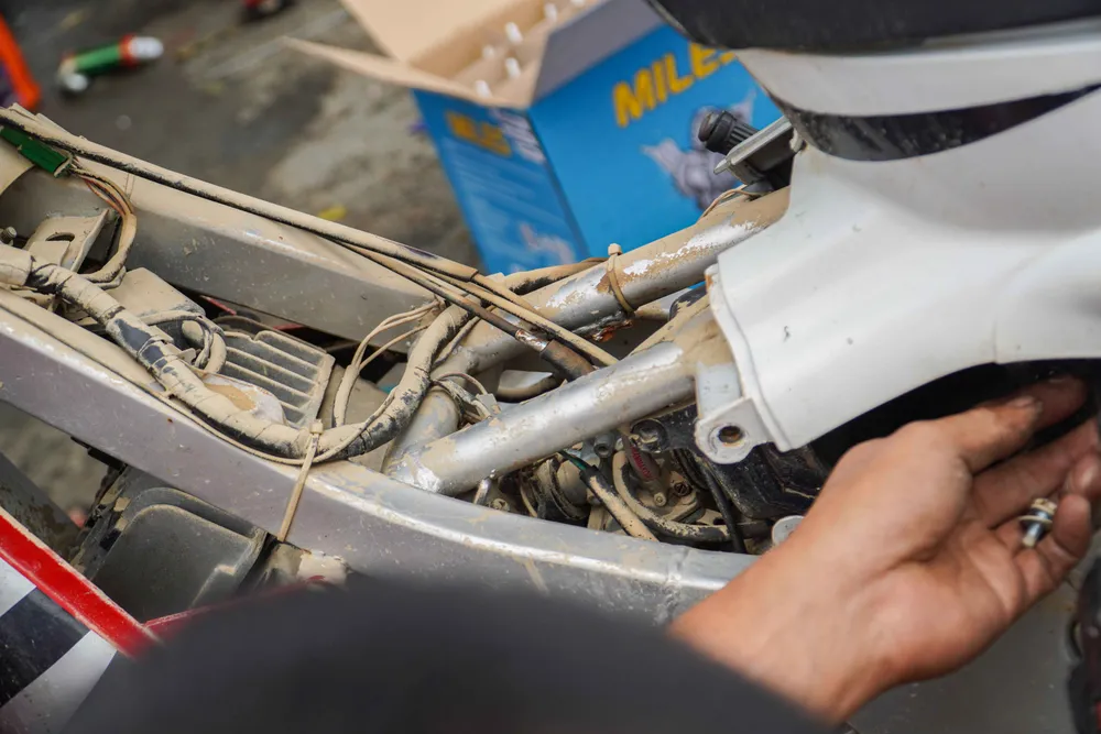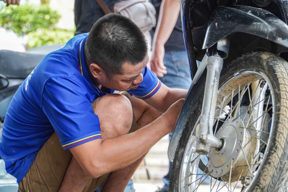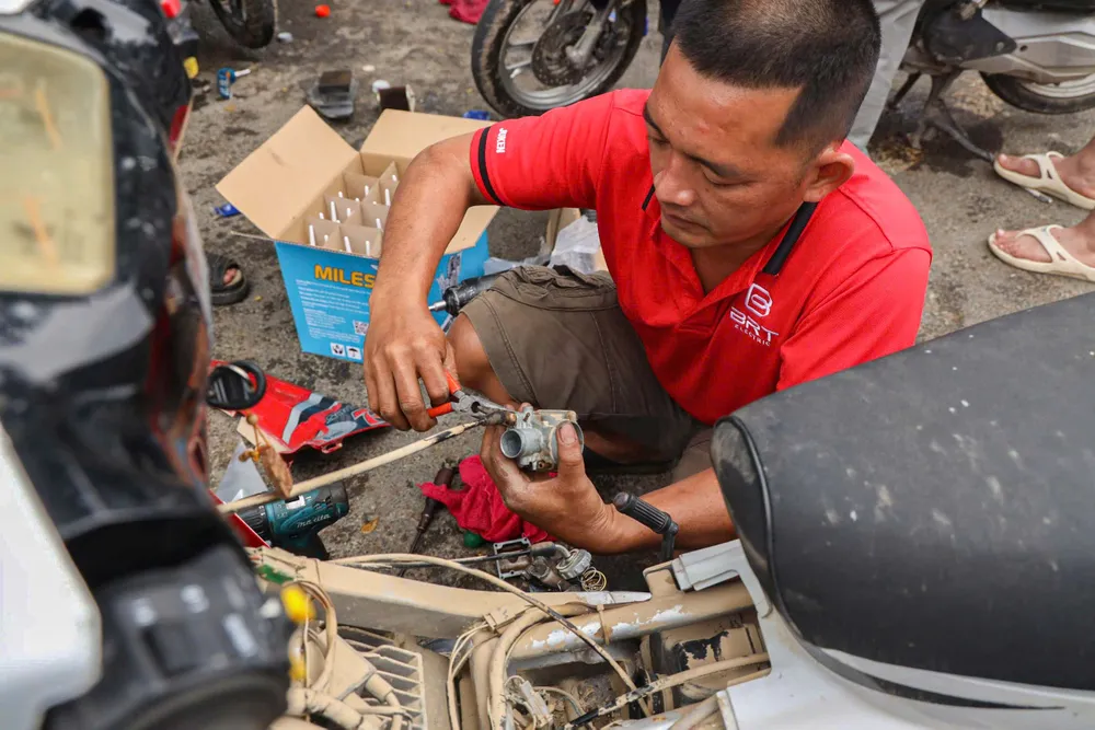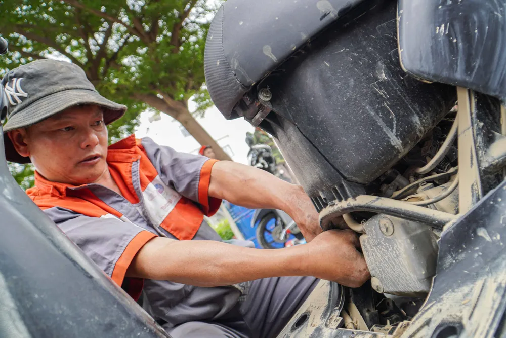Ngay khi nhận xe, người thợ bắt tay ngay vào sửa chữa. "Xe máy của người dân sẽ được vệ sinh, xả nước, thay nhớt, thay bu-gi, làm sạch lọc gió; kiểm tra hệ thống điện, phanh, xích, đèn, ắc quy; tư vấn người dân nhận diện hư hỏng sau ngập nước và hướng dẫn bảo dưỡng đúng cách"- một thợ sửa xe cho biết.
