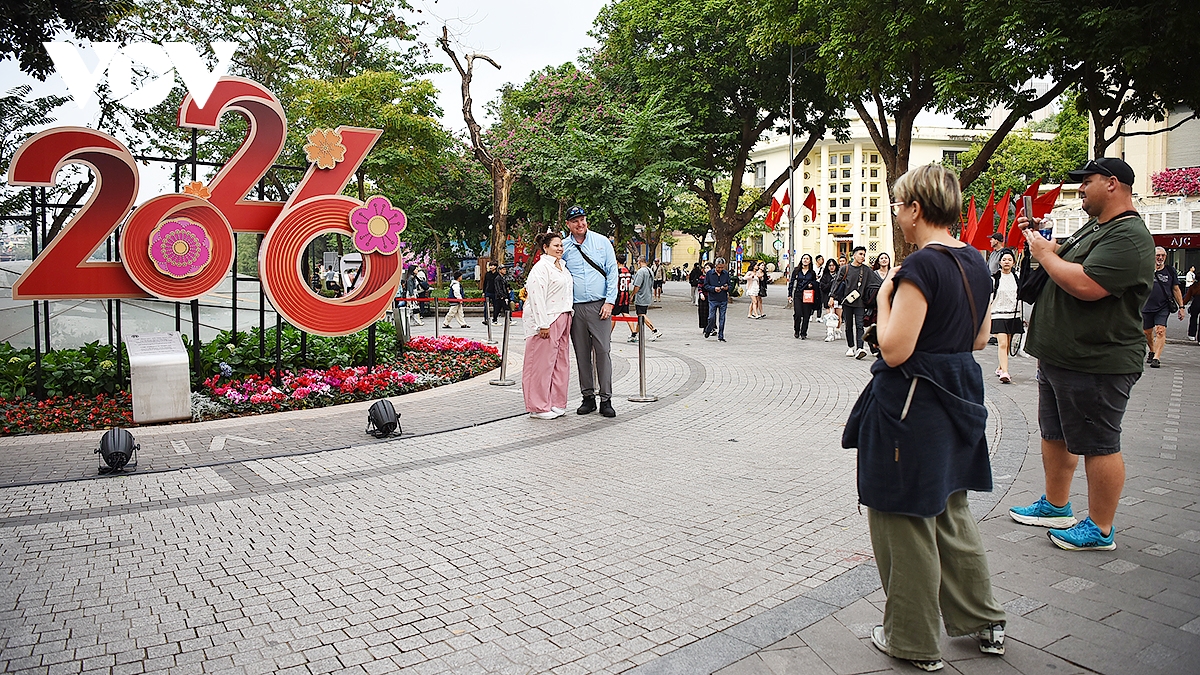 Tại khu vực phố đi bộ hồ Hoàn Kiếm, du khách quốc tế hào hứng chụp ảnh bên các biểu tượng check-in chào năm mới 2026.