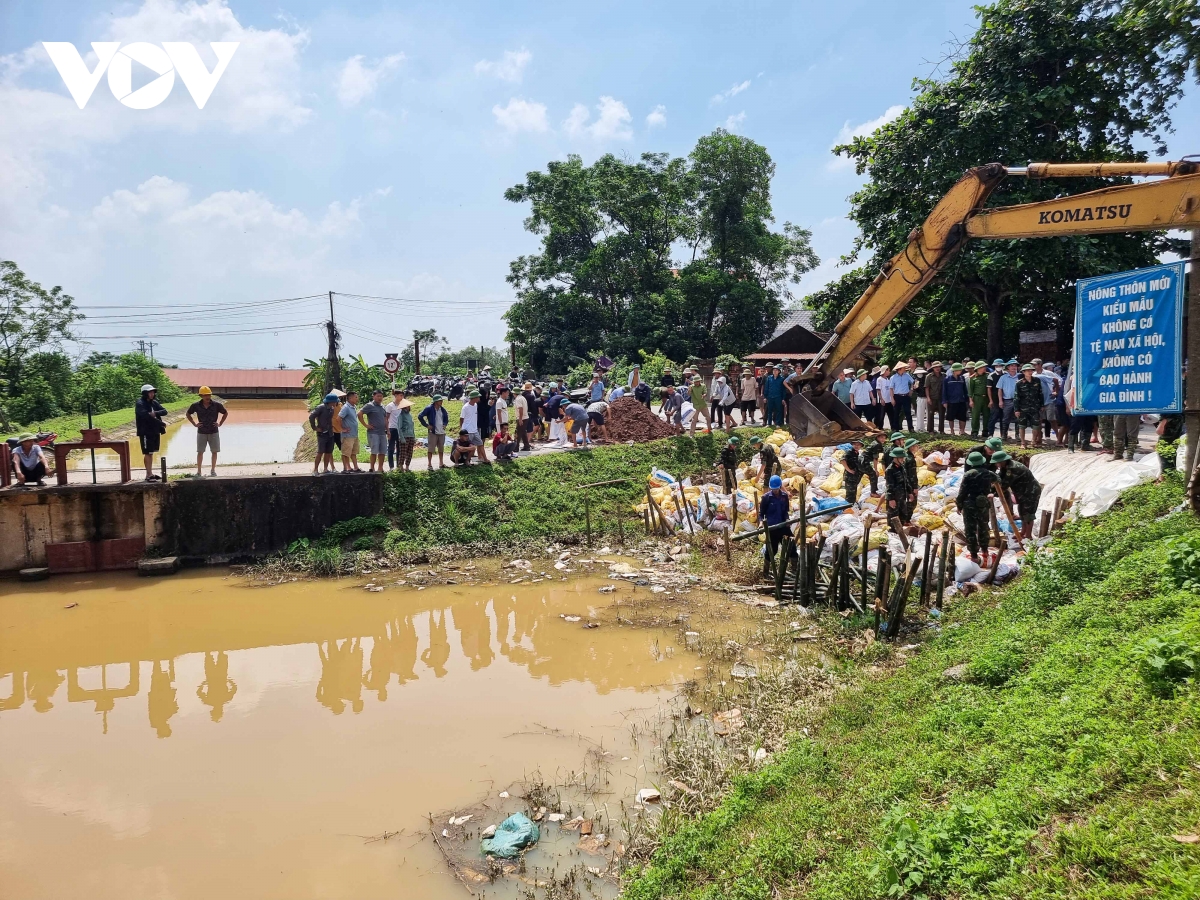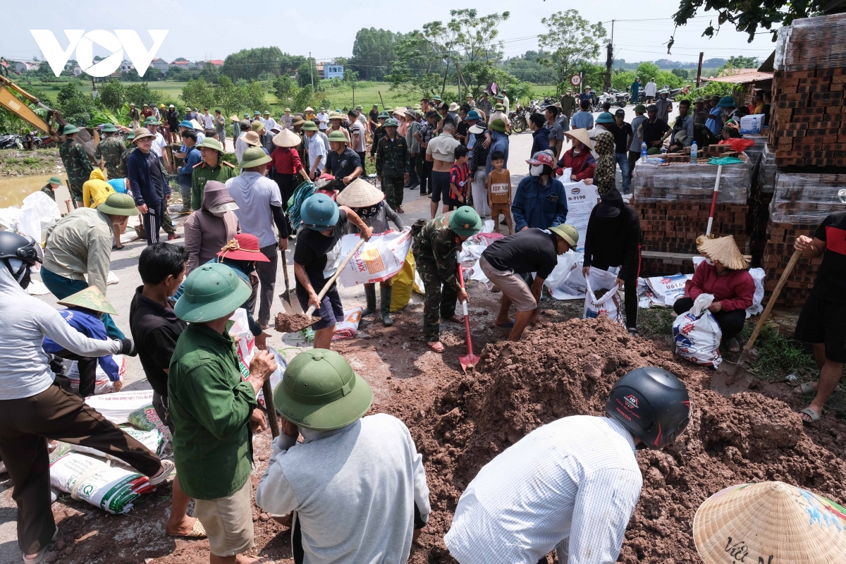 Tại khu vực thôn Cẩm Bào, xã Xuân Cẩm (Bắc Ninh) hàng trăm cán bộ chiến sĩ, lực lượng vũ trang cùng chính quyền nhân dân nhanh chóng gia cố vết nứt mạch đùn, mạch sủi khu vực sông Cầu.