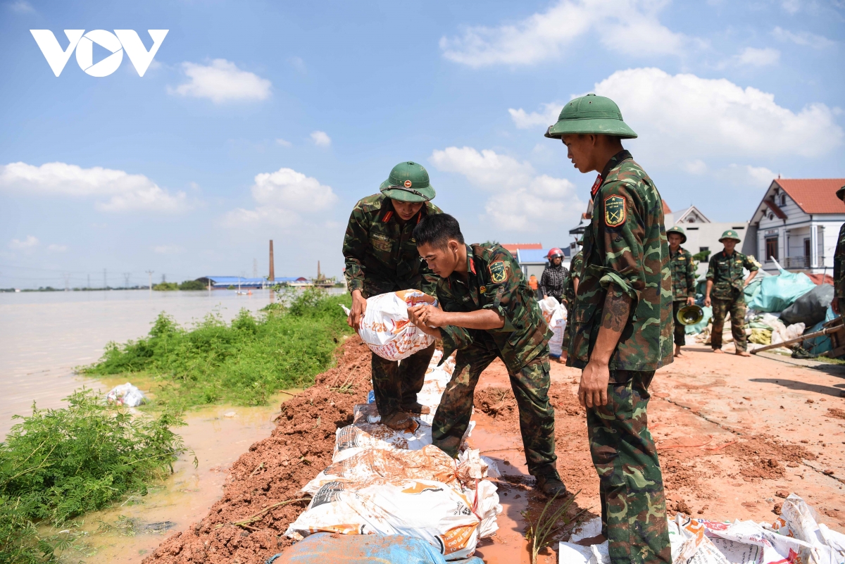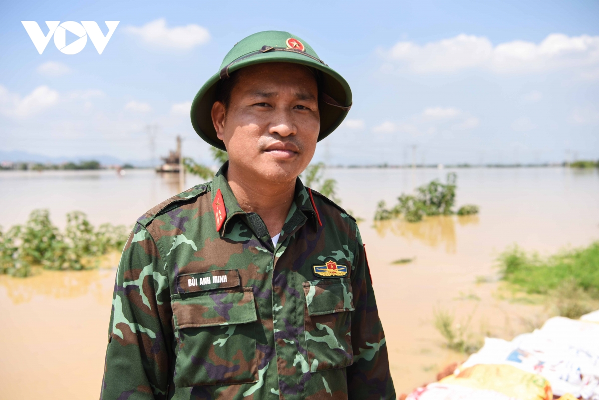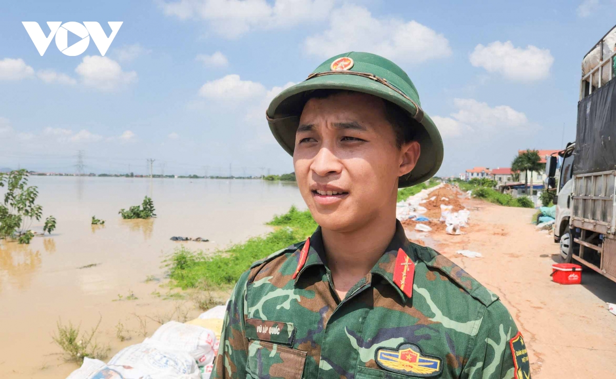 Hạ sĩ Vũ Lập Quốc, Tiểu đội Trưởng thuộc Trung đoàn 2, Sư đoàn 3, Quân khu 1 cho biết: “Nhìn nước lũ đang cao, các chiến sĩ đều cố gắng đắp bao đất, khó khăn nhất là khi đắp đất, nước vẫn tràn qua khiến mặt đê trũng nước, đòi hỏi mỗi cán bộ chiến sĩ phải thật sự khéo léo, nâng từng bao đất. Song mỗi cán bộ Trung đoàn 2 luôn luôn động viên nhau khắc phục, cố gắng vì nhân dân ở phía sau”.
