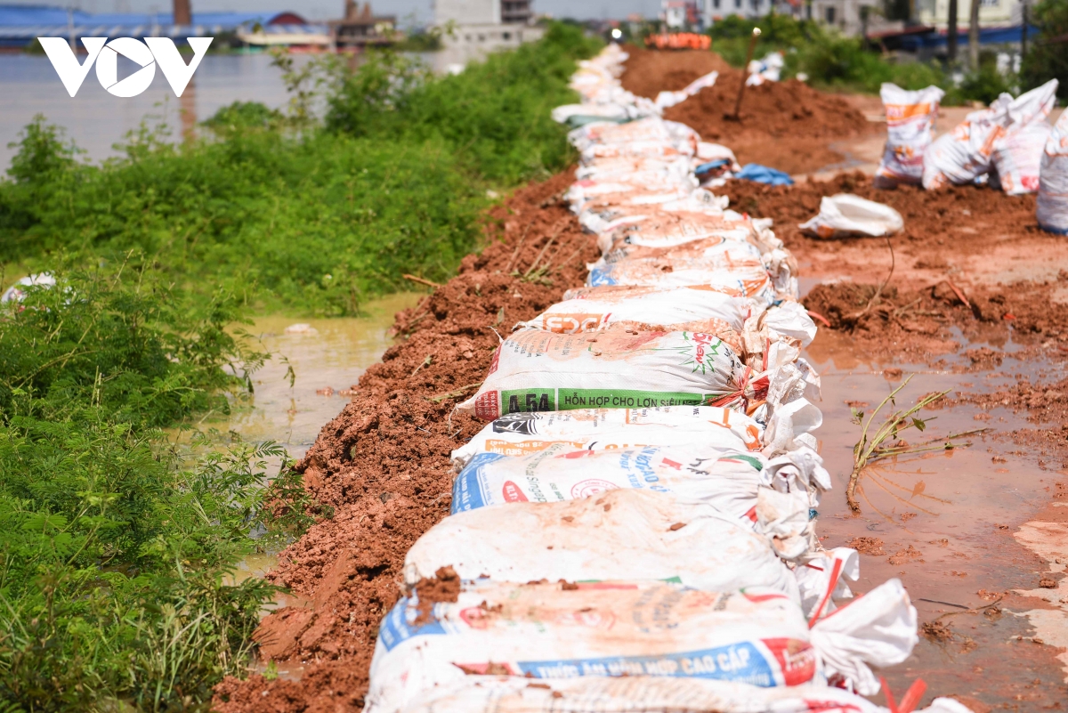 Hàng nghìn bao đất kè lại thân đê chống tràn ngập nước