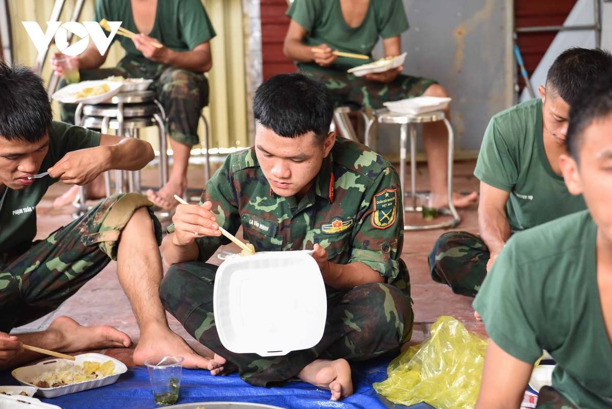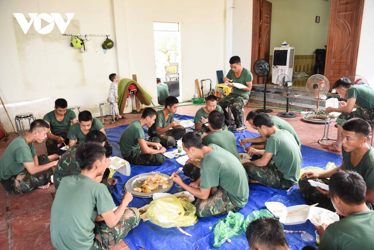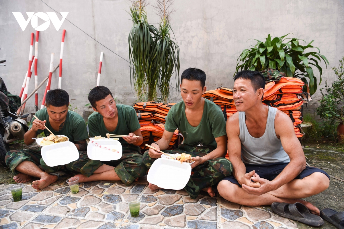 Cán bộ, chiến sĩ Trung đoàn 2 ăn tranh thủ, ngủ khẩn trương để tiếp tục công tác khắc phục thân đê đảm bảo an toàn cho người dân.