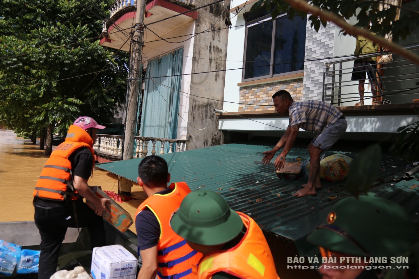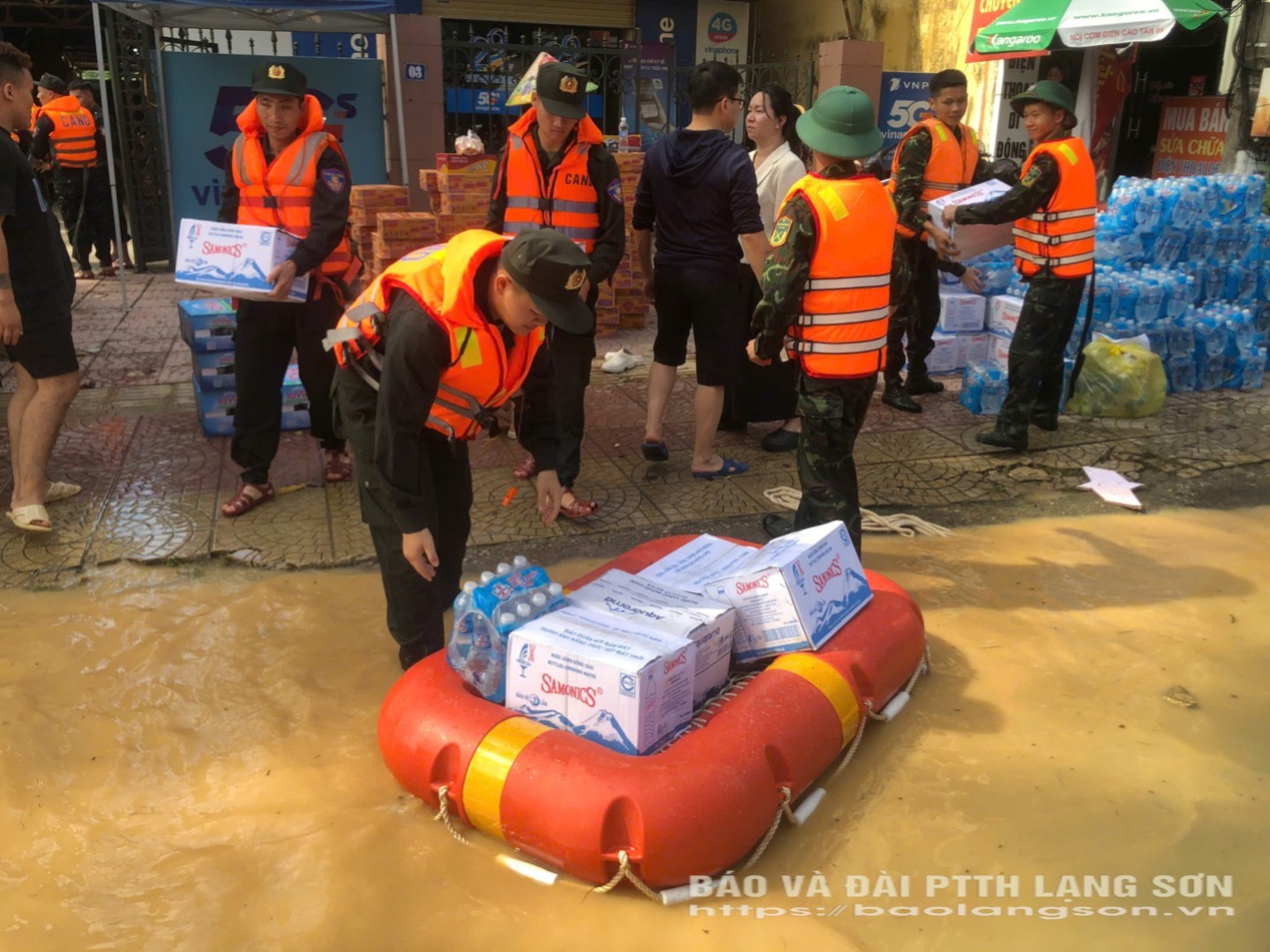 Lực lượng chức năng sử dụng xuồng để đưa thực phẩm, nước uống hỗ trợ nhân dân khu vực ngập lụt tại địa bàn huyện Hữu Lũng cũ