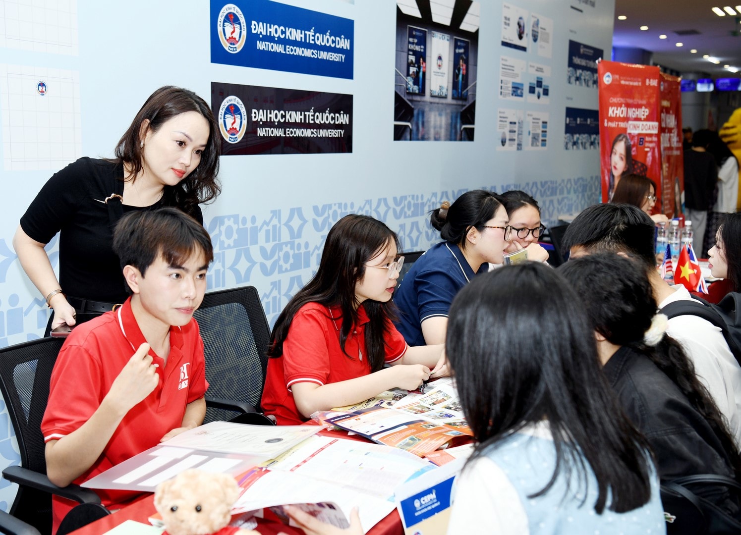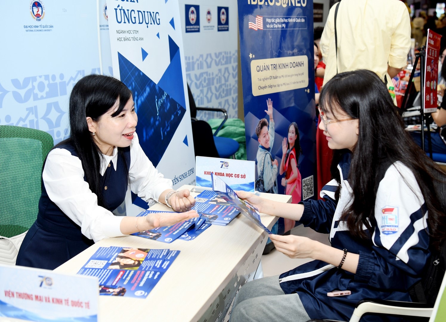 Giảng viên, sinh viên Đại học Kinh tế Quốc dân tư vấn về các chương trình đào tạo cho thí sinh.