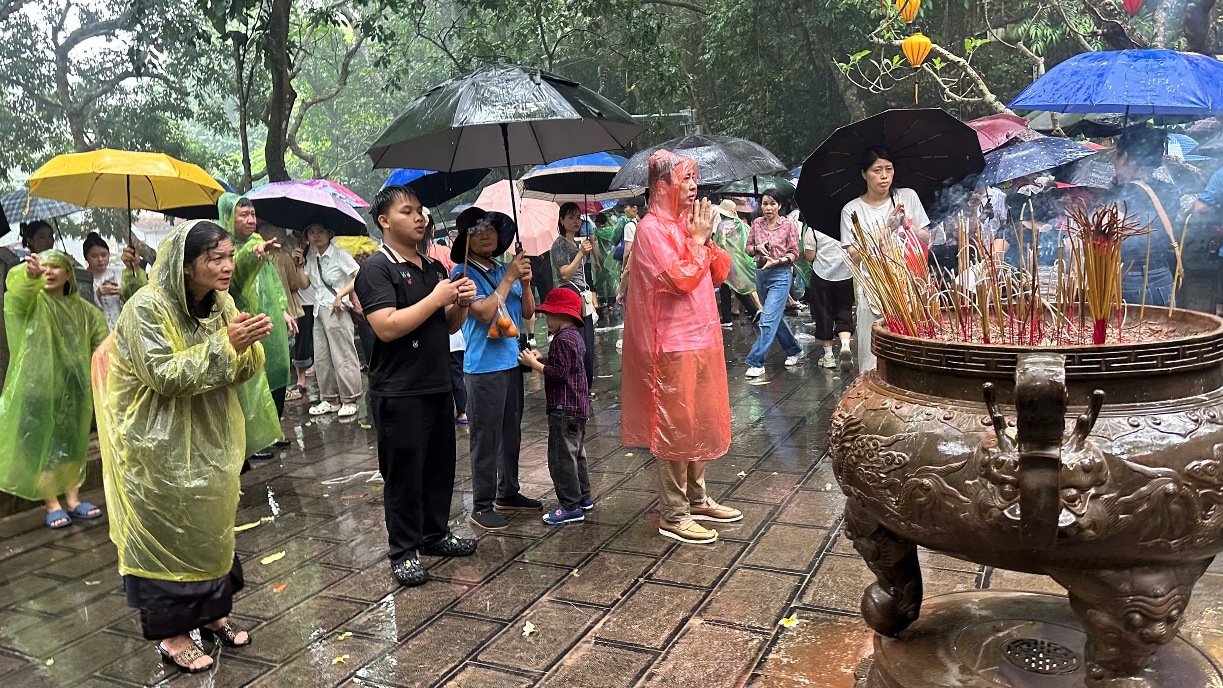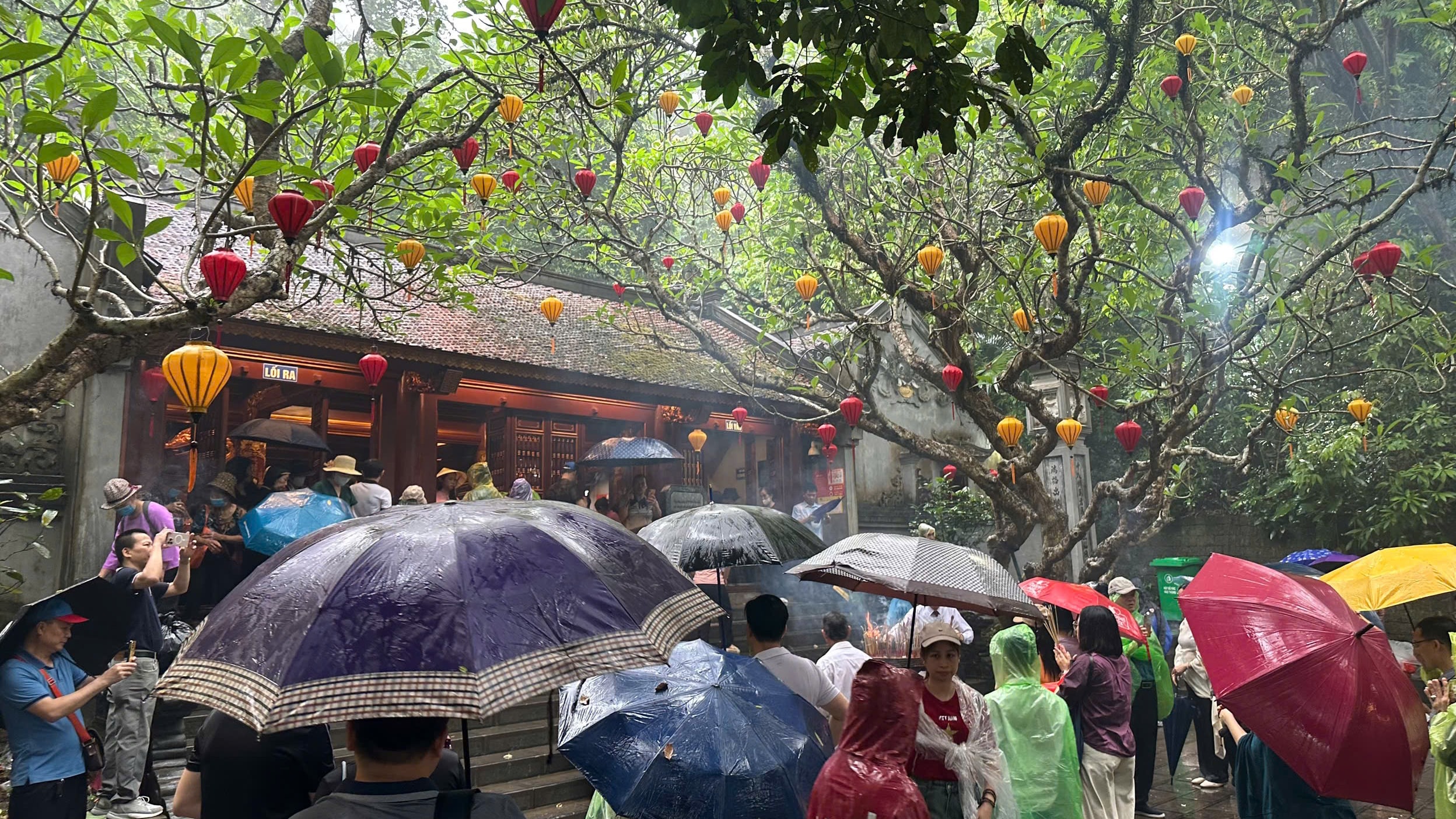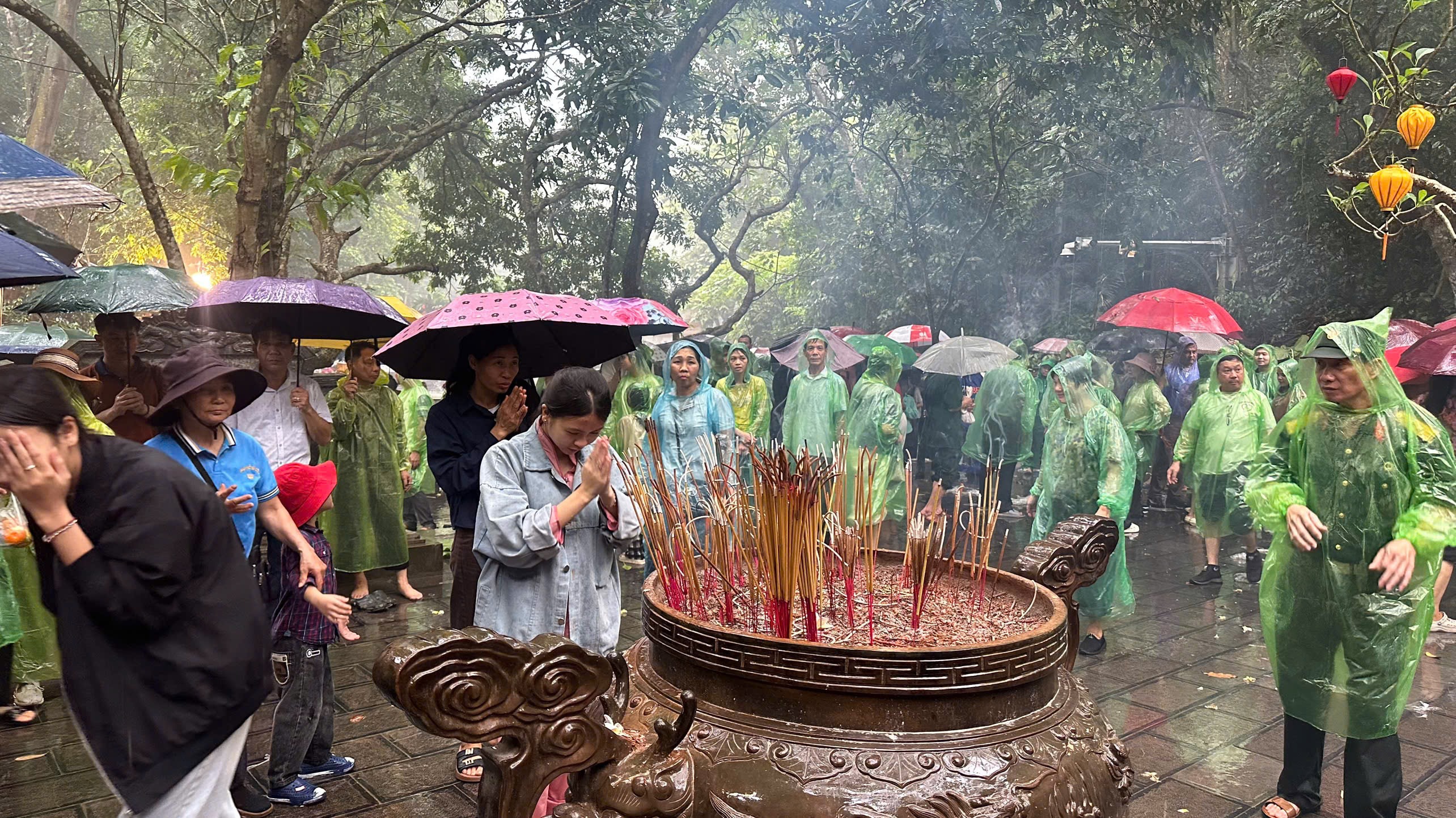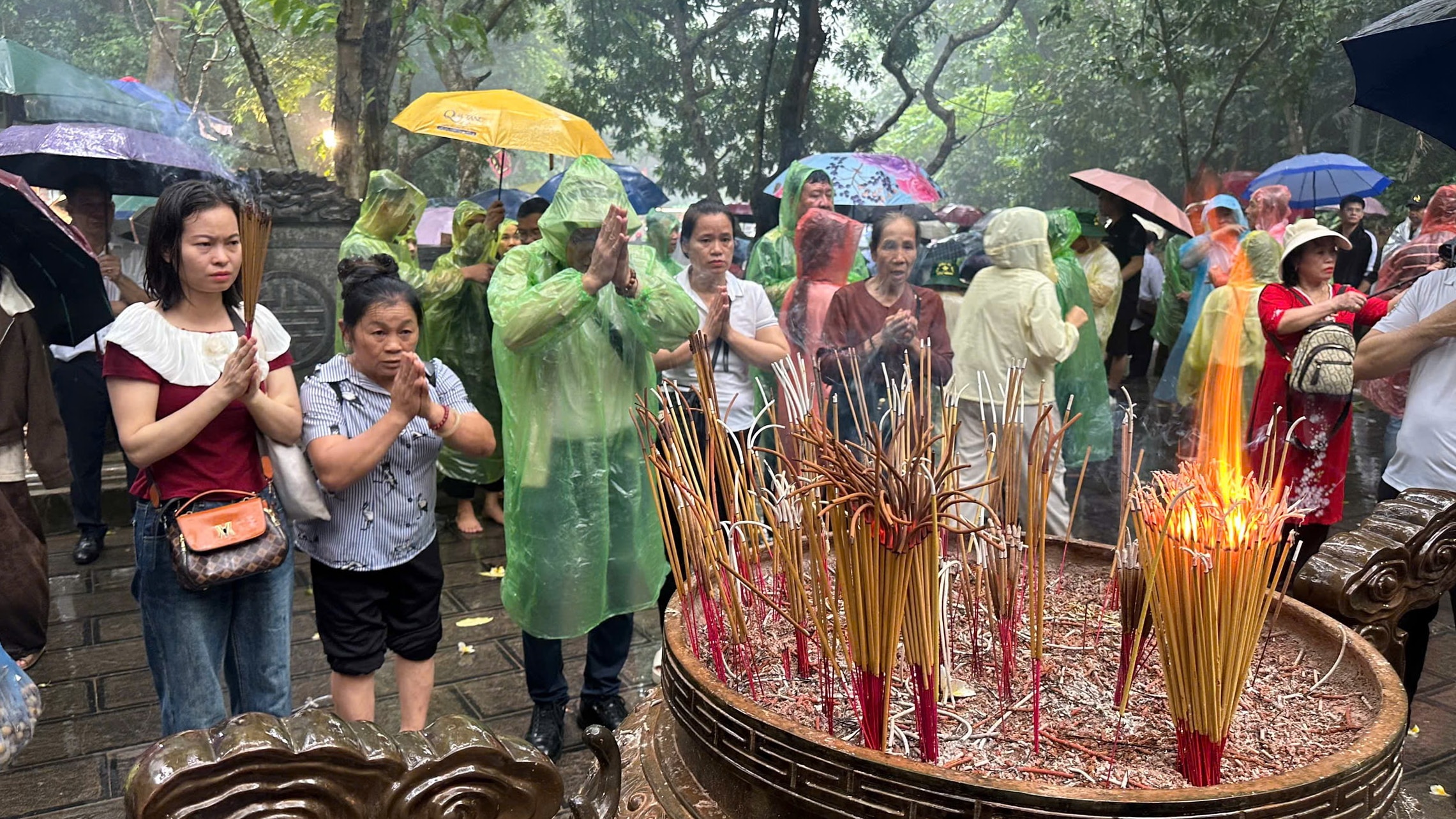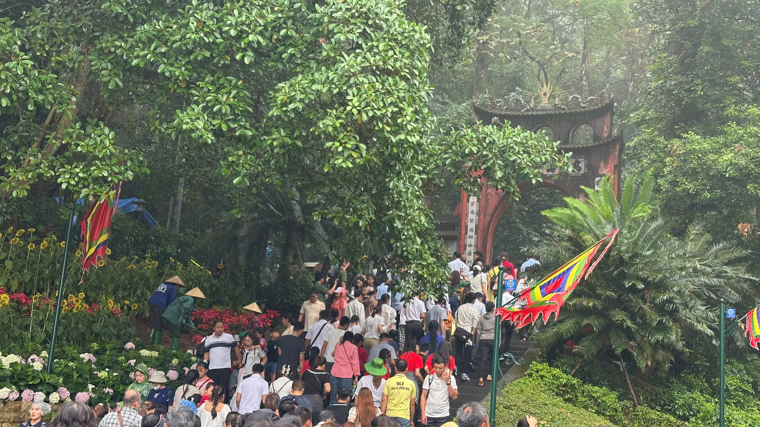 Dù thời tiết mưa, không thuận lợi nhưng dòng người vẫn đổ về để lên núi Nghĩa Lĩnh dâng hương tưởng nhớ các Vua Hùng. Ảnh: Trường Quân