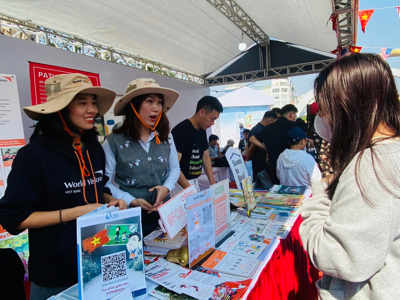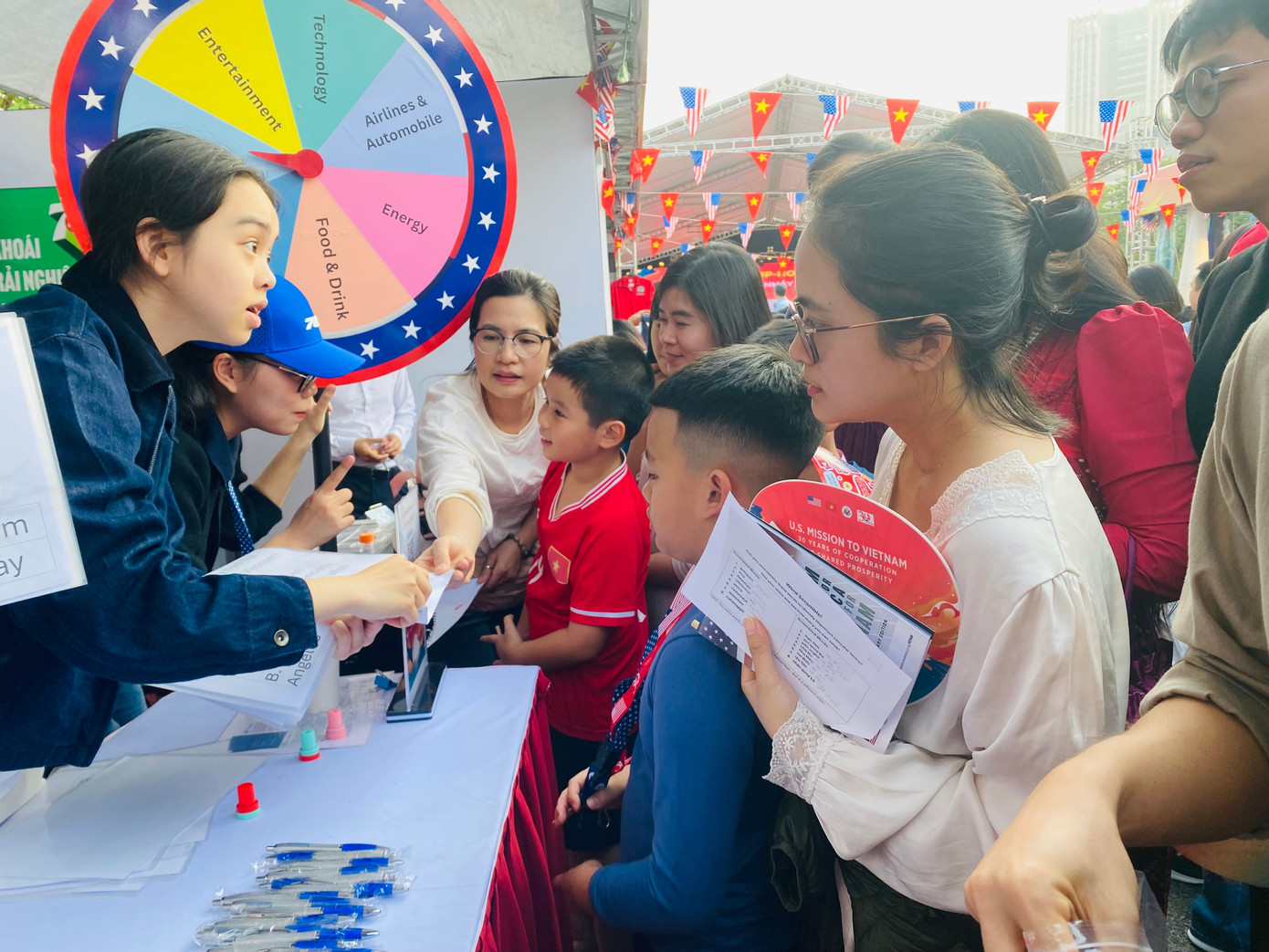 Đông đảo người dân Hà Nội tham gia các trò chơi đố vui, tìm hiểu về lịch sử và văn hóa Mỹ, hoạt động của các tổ chức phi chính phủ như World Vision. Ảnh: Thu Loan.