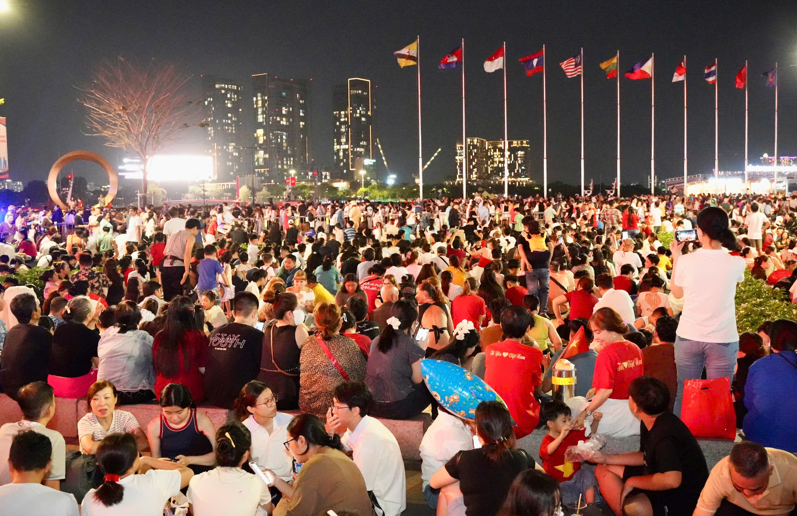 Tại khu vực trung tâm TP.HCM nơi có trận địa pháo hoa tầm cao khu vực đầu hầm sông Sài Gòn (phường An Khánh) và điểm pháo hoa tầm thấp tòa nhà tài chính Saigon Marina IFC (phường Sài Gòn) thu hút đông đảo người dân, du khách đến chờ từ sớm.