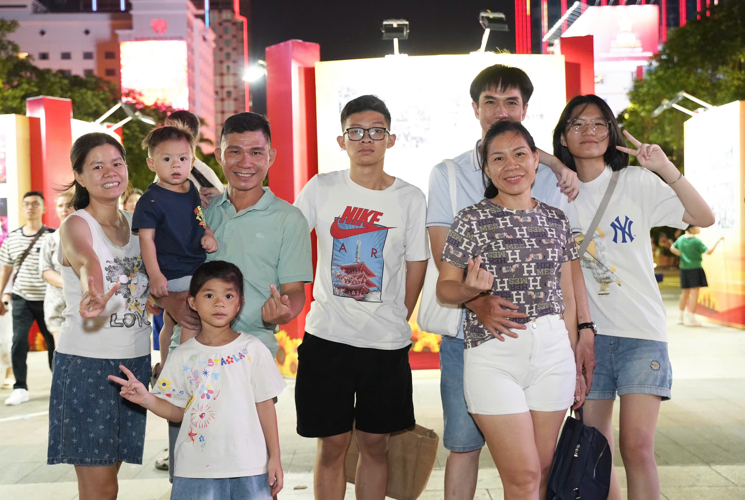 Gia đình chị Linh Sương (bìa trái) đi từ phường Phước Long đến trung tâm TP để chờ đợi màn pháo hoa đặc sắc trong ngày lễ kỷ niệm trọng đại của đất nước.