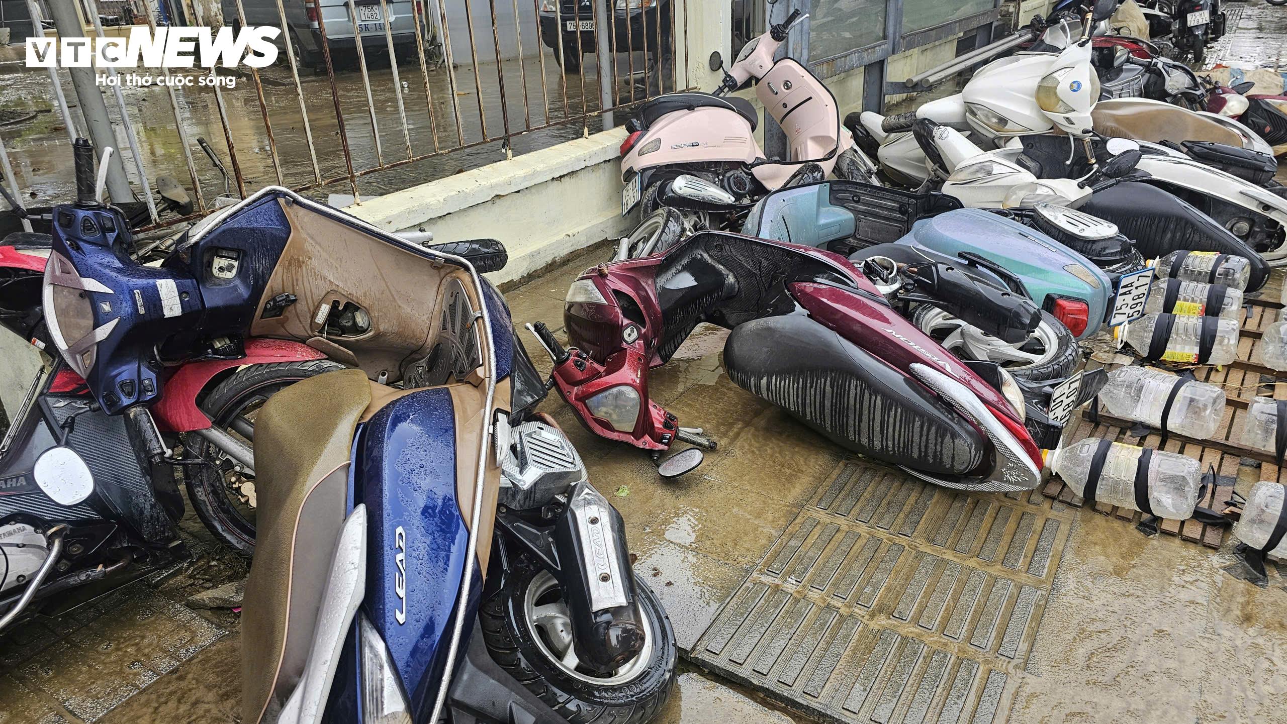 Những chiếc xe máy ngã rạp, ngổn ngang sau khi lũ rút, vẫn chưa được chủ nhân ra nhận lại.