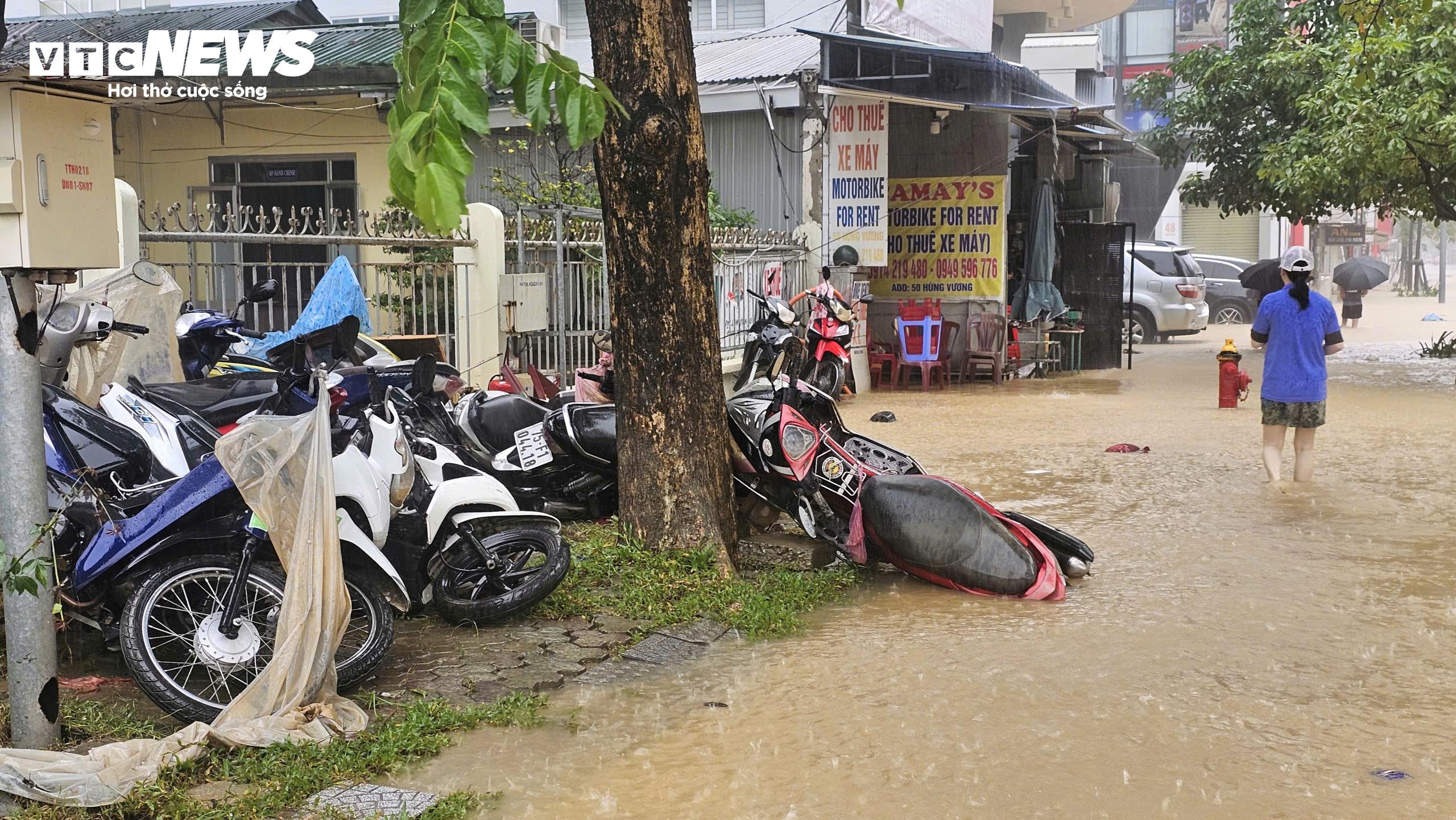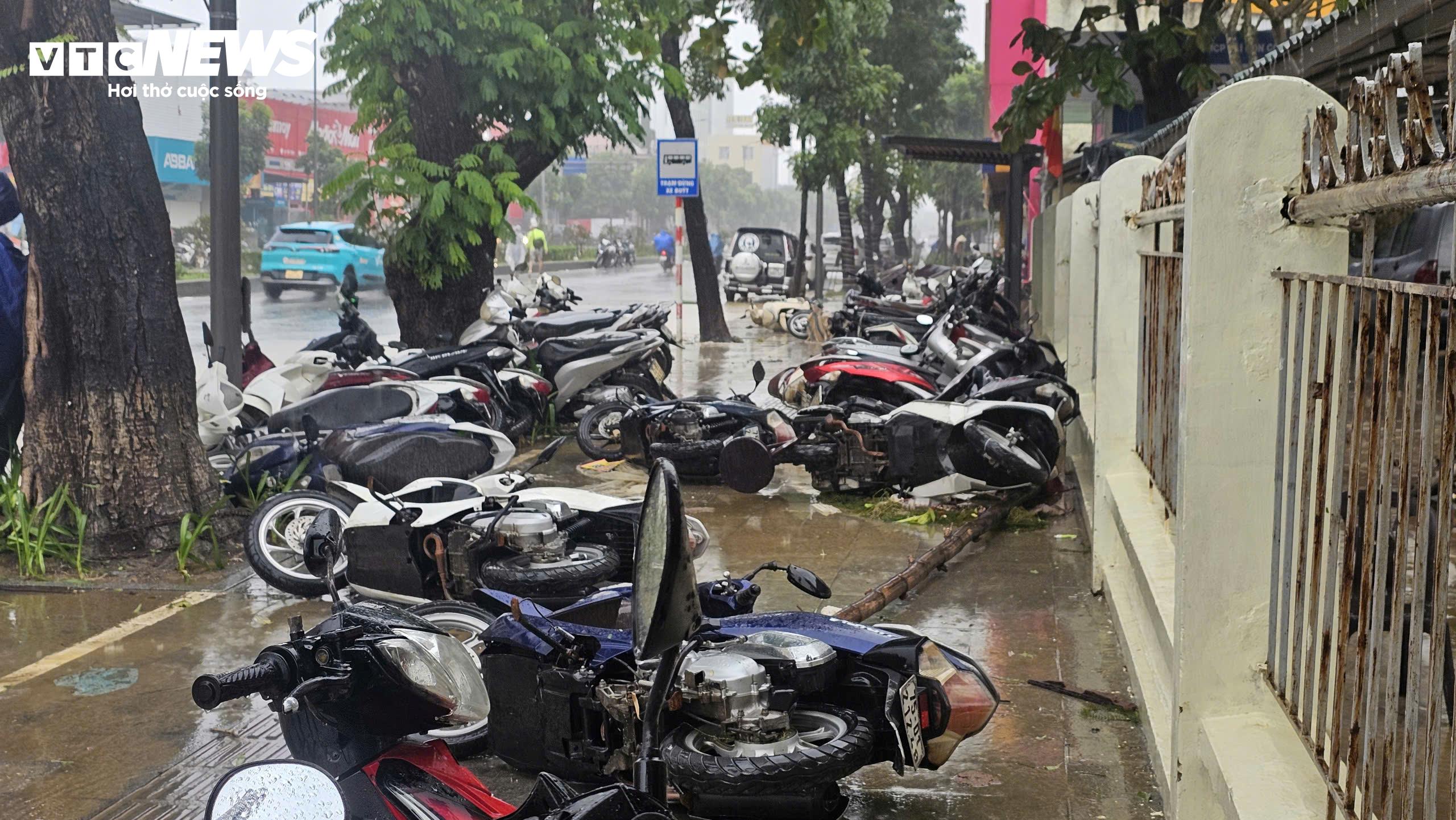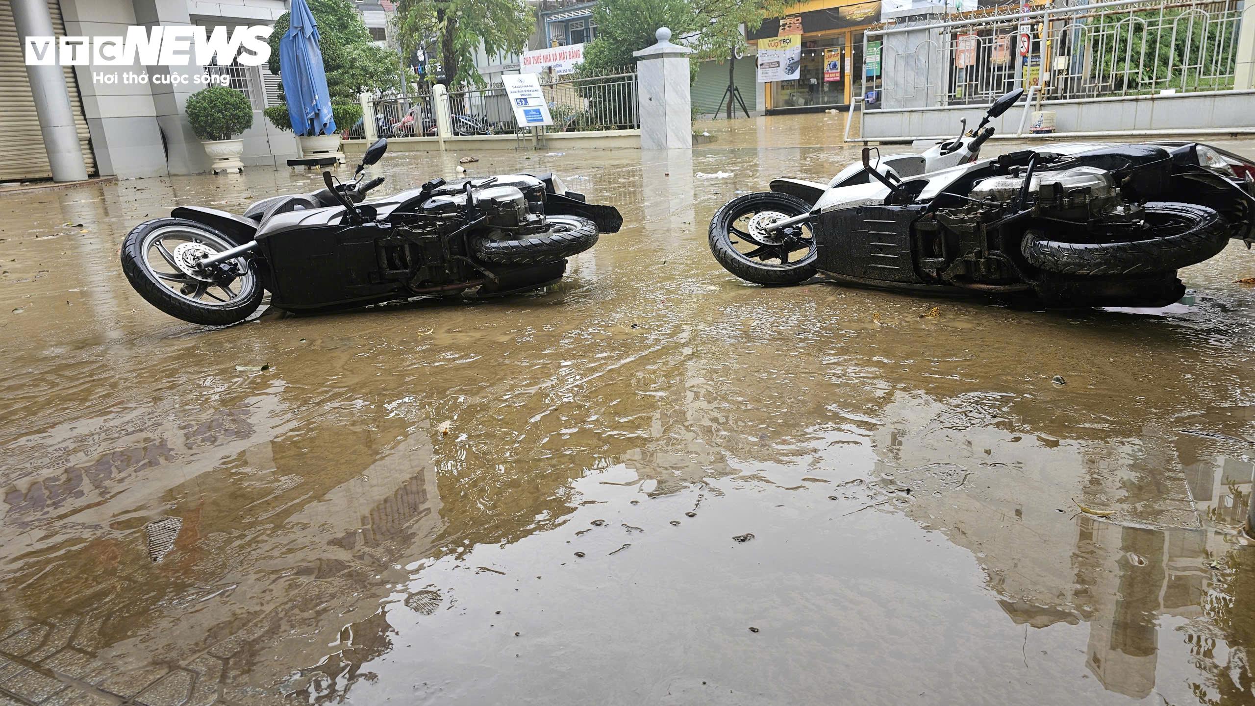 Tại các tuyến đường trung tâm như Hà Nội, Hùng Vương, hàng loạt xe máy của người dân để trên vỉa hè bị phủ đầy bùn đất, một số bị dòng nước mạnh làm đổ ngổn ngang.