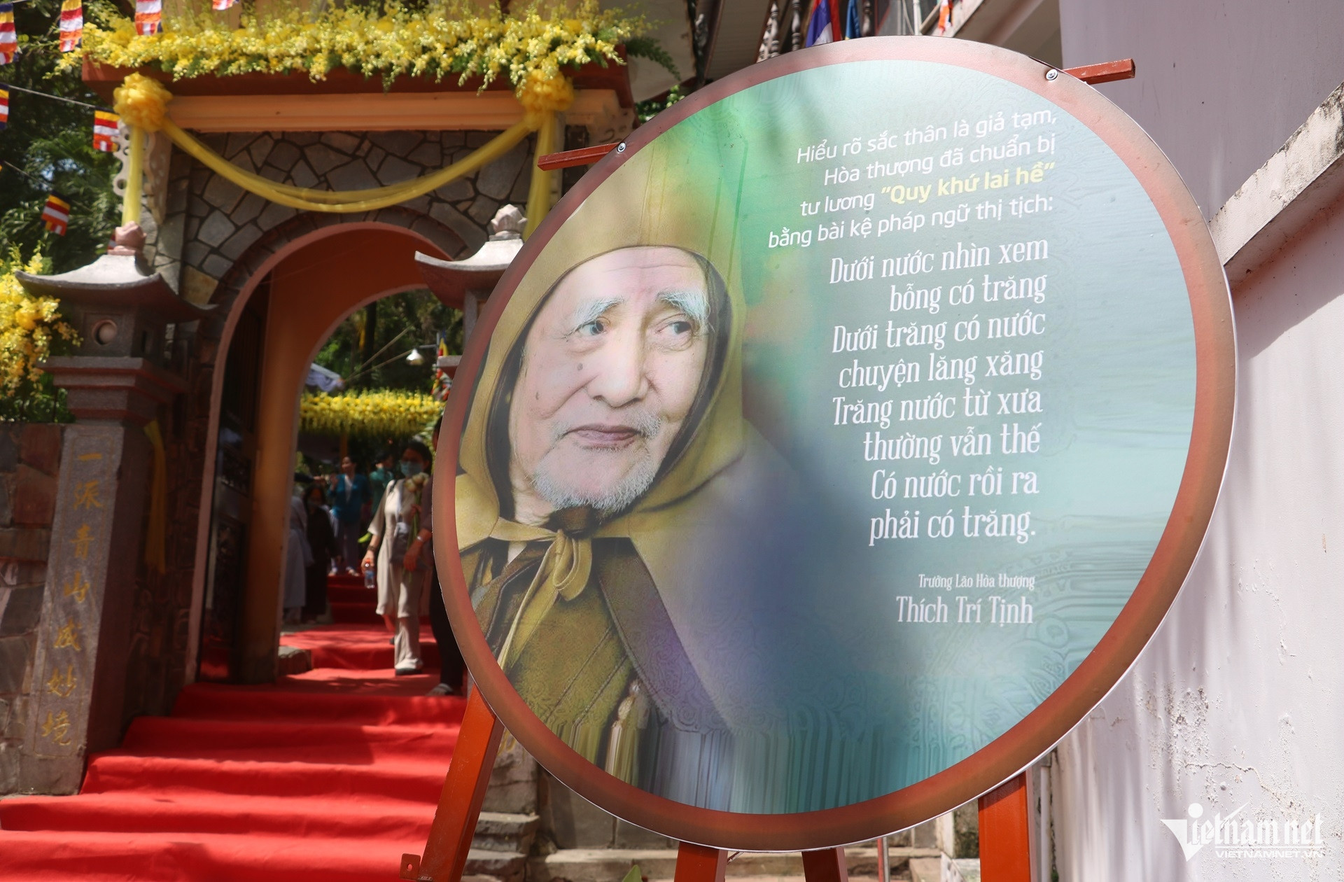 Tại lối lên chùa, hình ảnh Trưởng lão Hòa thượng Thích Trí Tịnh cùng bài kệ được trưng bày trang trọng, nhắc nhớ giáo lý vô thường và trí tuệ thâm sâu Ngài để lại cho hậu thế, dẫn dắt bước chân tăng ni, phật tử vào lễ cung thỉnh kim quan.