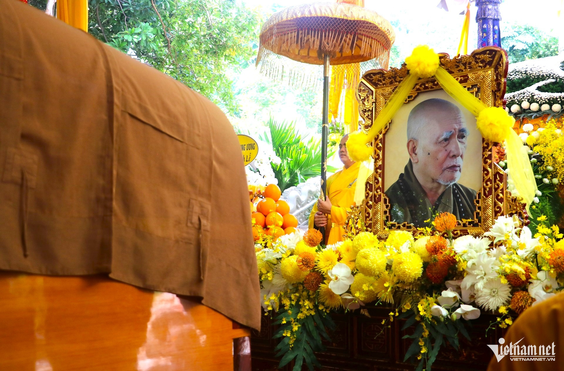 Đến khoảng 10h50, kim quan Trưởng lão Hòa thượng được phụng thỉnh và hạ đặt trang nghiêm trước khu vực bảo tháp. Di ảnh Trưởng lão Hòa thượng Thích Trí Tịnh được an vị trang nghiêm trước bảo tháp, phủ đầy hoa vàng - biểu trưng cho đạo hạnh và công đức.