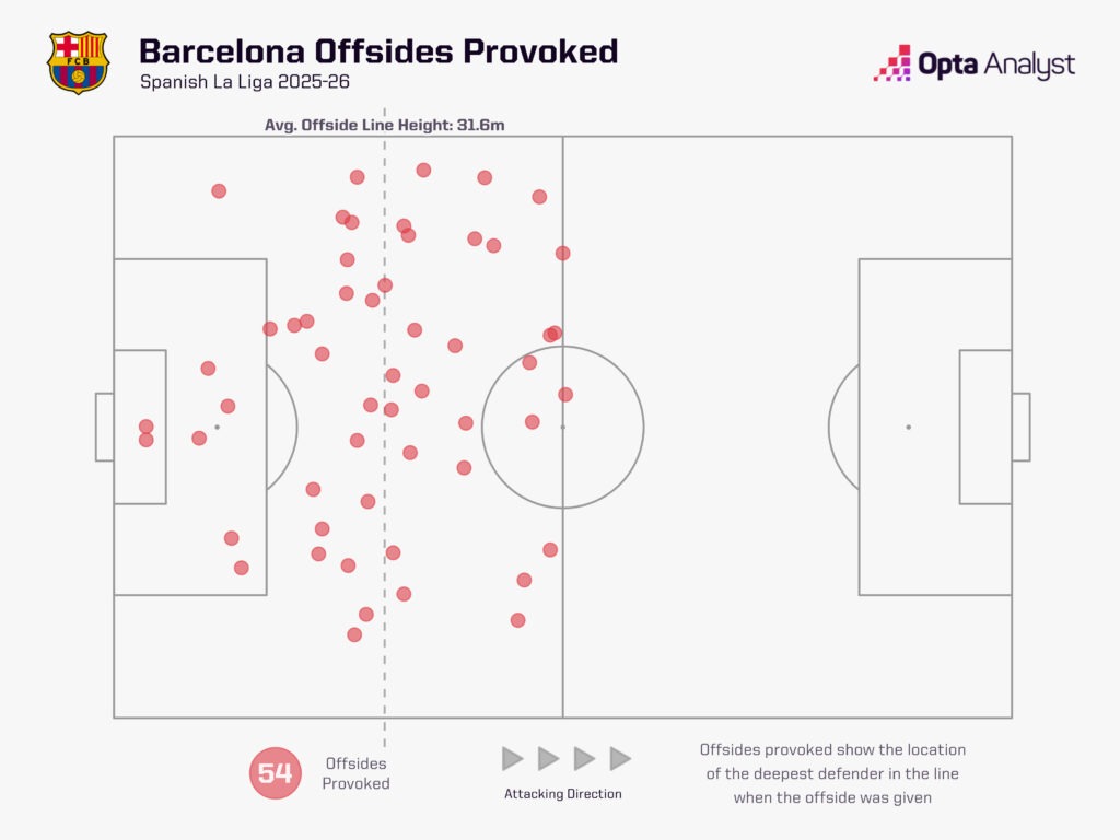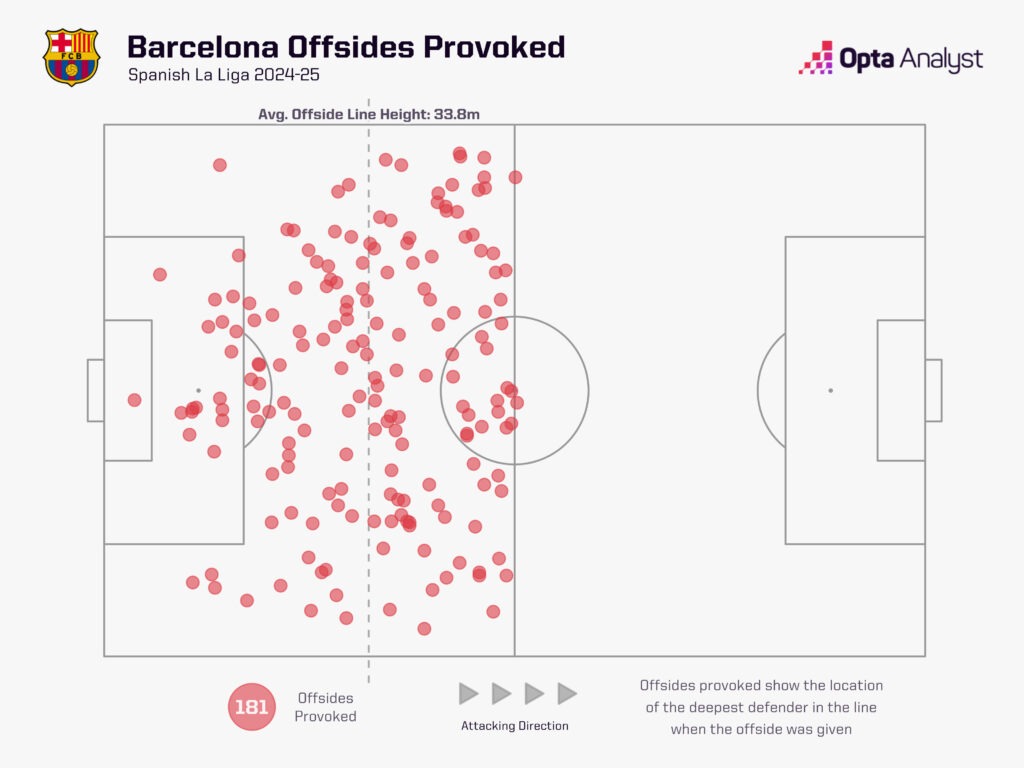 Đỉnh điểm là chiến thắng 4-0 đầy kinh ngạc trước Real Madrid tại El Clásico vào tháng 10 - 2024. Trận đấu đó, mọi ánh mắt đổ dồn vào hàng thủ của Barça khi họ bắt việt vị siêu sao Kylian Mbappé tới tám lần – một con số kỷ lục. Thống kê khi đó cho thấy, Barcelona bắt việt vị đối thủ trung bình 7 lần mỗi trận, một chỉ số độc nhất vô nhị trong 5 giải đấu hàng đầu châu Âu. Tổng cộng 77 lần bắt việt vị thành công của họ còn nhiều hơn cả tổng số của hai đội xếp sau cộng lại. Đường bắt việt vị trung bình của họ, ở mốc 33.8m so với khung thành, là minh chứng rõ ràng nhất cho sự táo bạo trong triết lý của Flick.