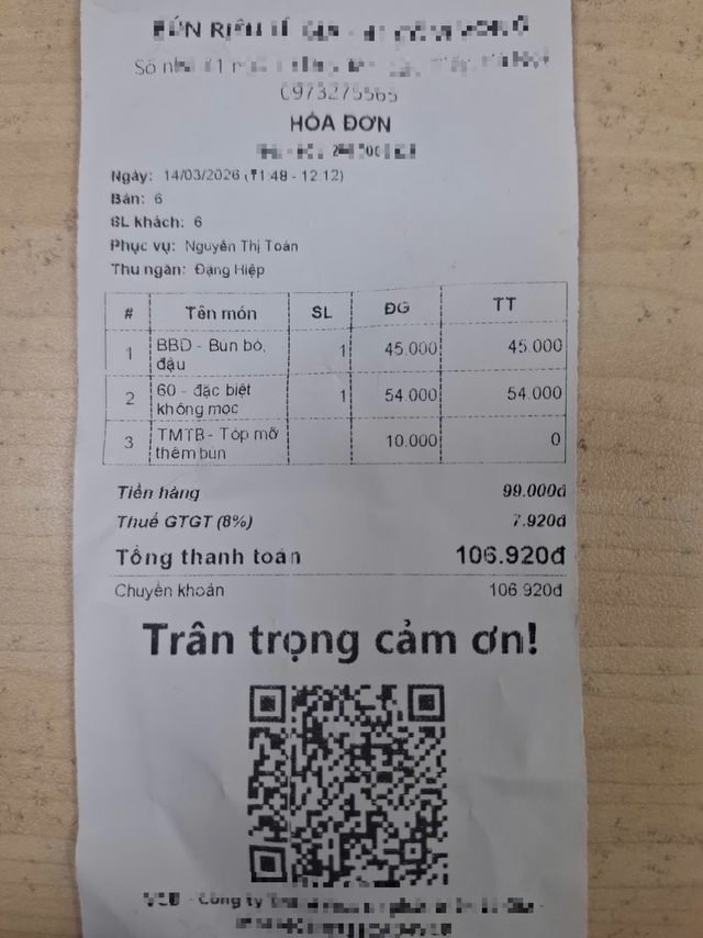 Chị Lan mới đây đi ăn bún phải trả thêm 8000 đồng tiền thuế giá trị gia tăng. Ảnh: NVCC.