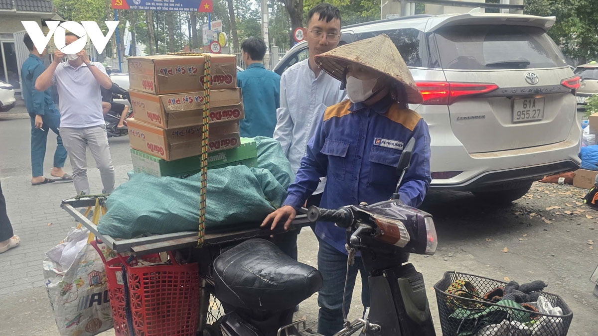 Theo ghi nhận của phóng viên, từng chiếc xe máy chở thùng mì gói, nước suối, quần áo cao quá đầu, xe ba gác nặng trịch gạo, hay cả những chiếc xe tải nhỏ chất đầy bánh, nước lọc, sữa, tất cả đều hối hả đổ về.