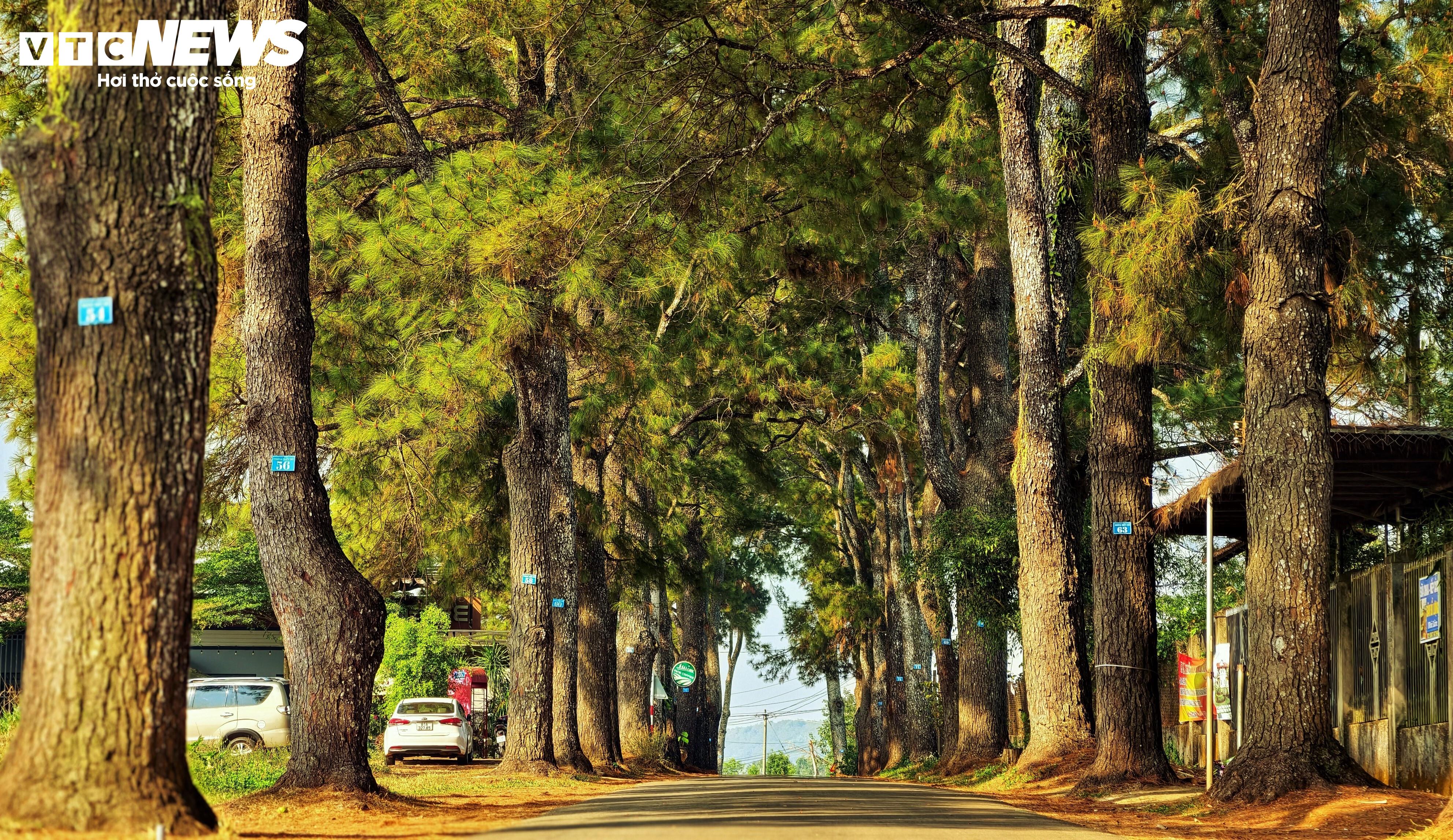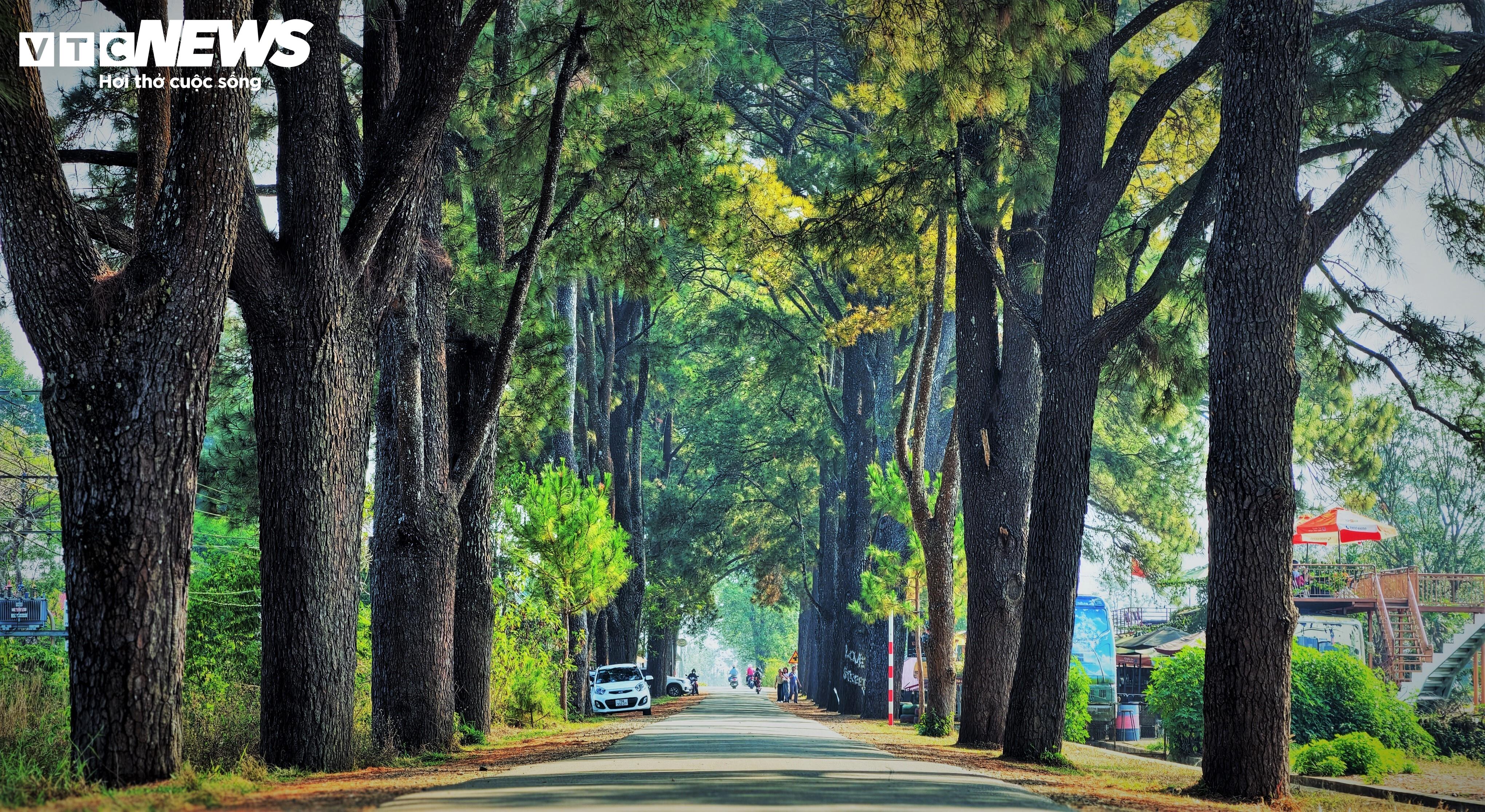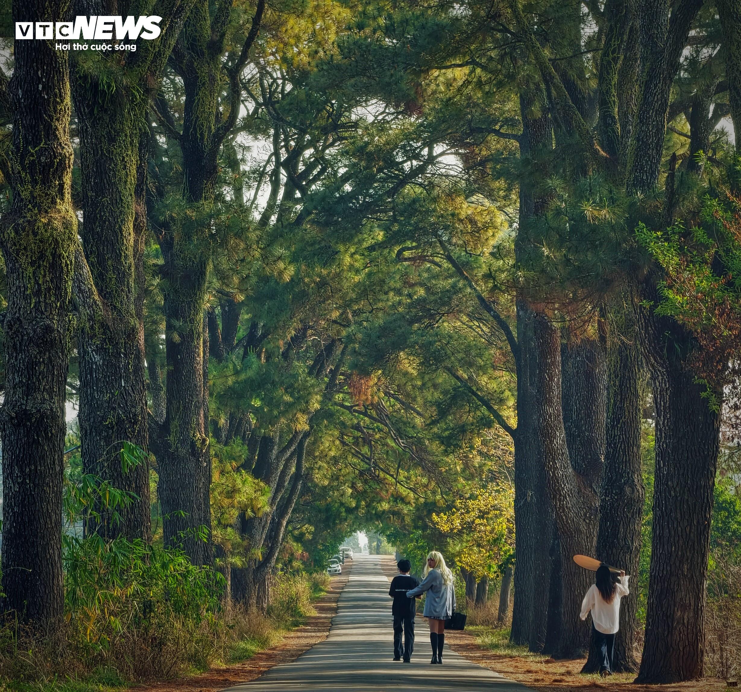Con đường với hai hàng thông cổ thụ vươn cao, tán lá đan xen vào nhau tạo thành một vòm mái xanh mướt.