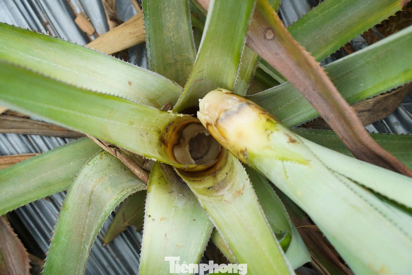 Bà Vũ Thị Duyên (SN 1956) cho biết, cuối năm 2024 gia đình xuống giống 8 sào dứa, dự kiến đến tháng 5/2026 sẽ cho thu hoạch. Tuy nhiên, đến thời điểm này, khi vườn dứa đang sinh trưởng tốt thì bất ngờ lá ngả vàng, thối gốc và chết hàng loạt không rõ nguyên nhân.