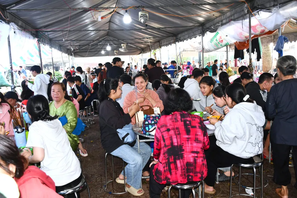 Những ngày này, du khách đến đây không chỉ để dâng hương tưởng niệm mà còn được thưởng thức nhiều món ăn chay dân dã, ngon miệng, từ bánh xèo đến các món cơm, nước uống.... tất cả đều miễn phí.