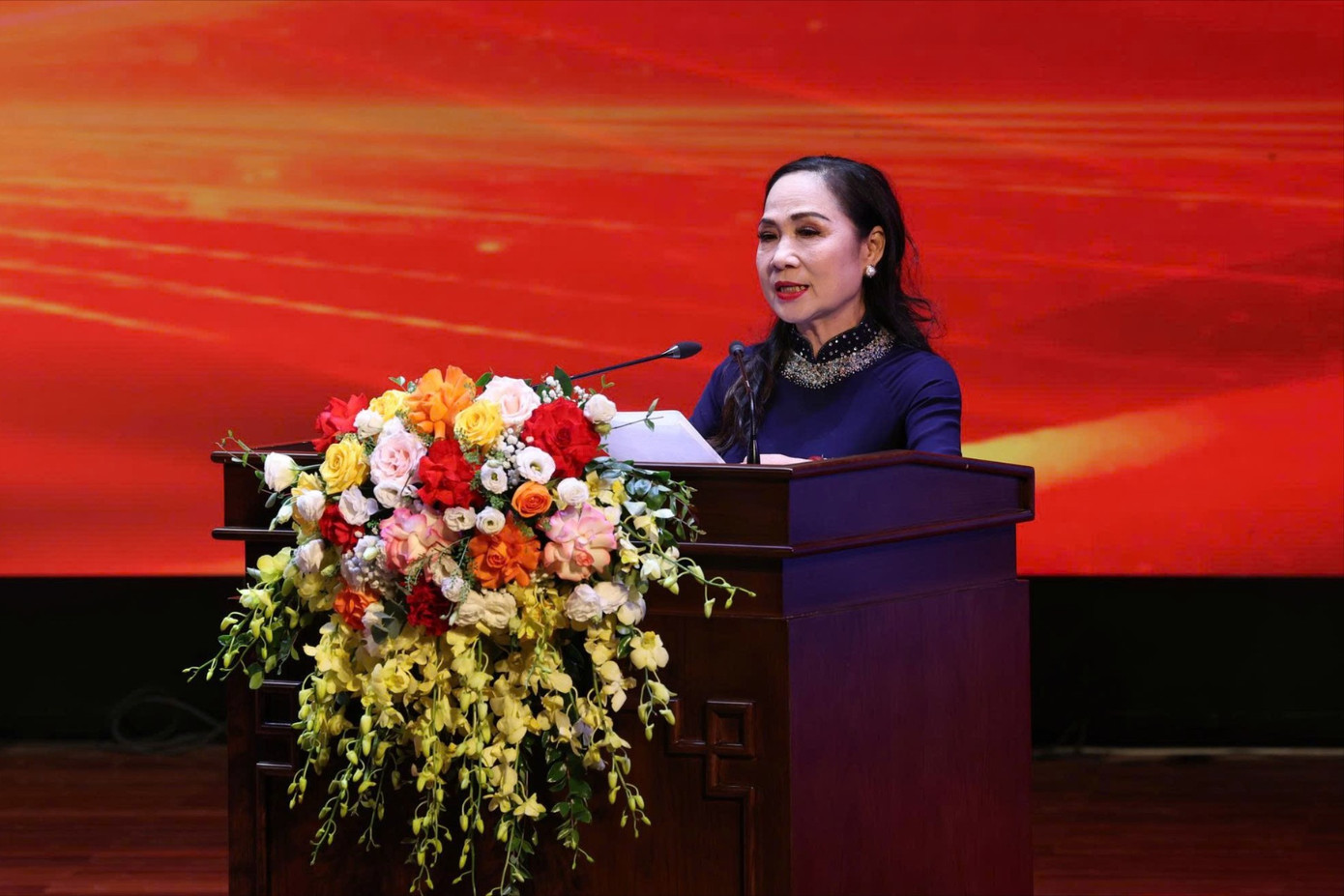 NSND Trịnh Thúy Mùi - Chủ tịch Hội Nghệ sĩ Sân khấu Việt Nam - phát biểu tại chương trình tối 3/10. Ảnh: Minh Quang.