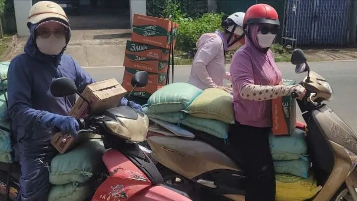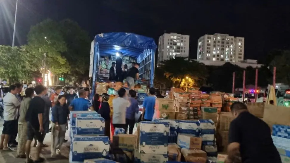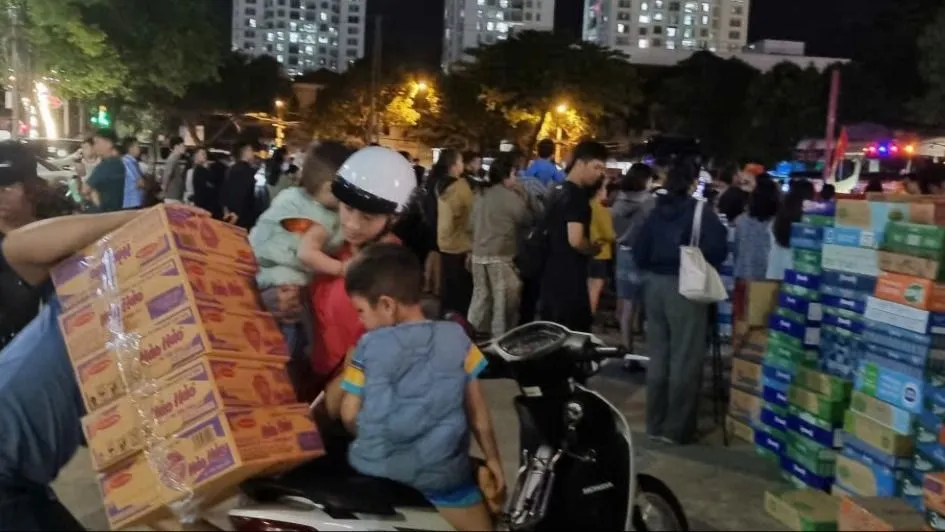Nhiều người khác xếp thành hàng dài, chuyền tay nhau từng thùng mì tôm, gói bánh để xếp lên xe cứu trợ. Mọi người vừa làm việc, vừa cười nói, tạo nên một không khí náo nhiệt nhưng cảm động khiến ai nấy chứng kiến đều rất đỗi tự hào, xúc động.
