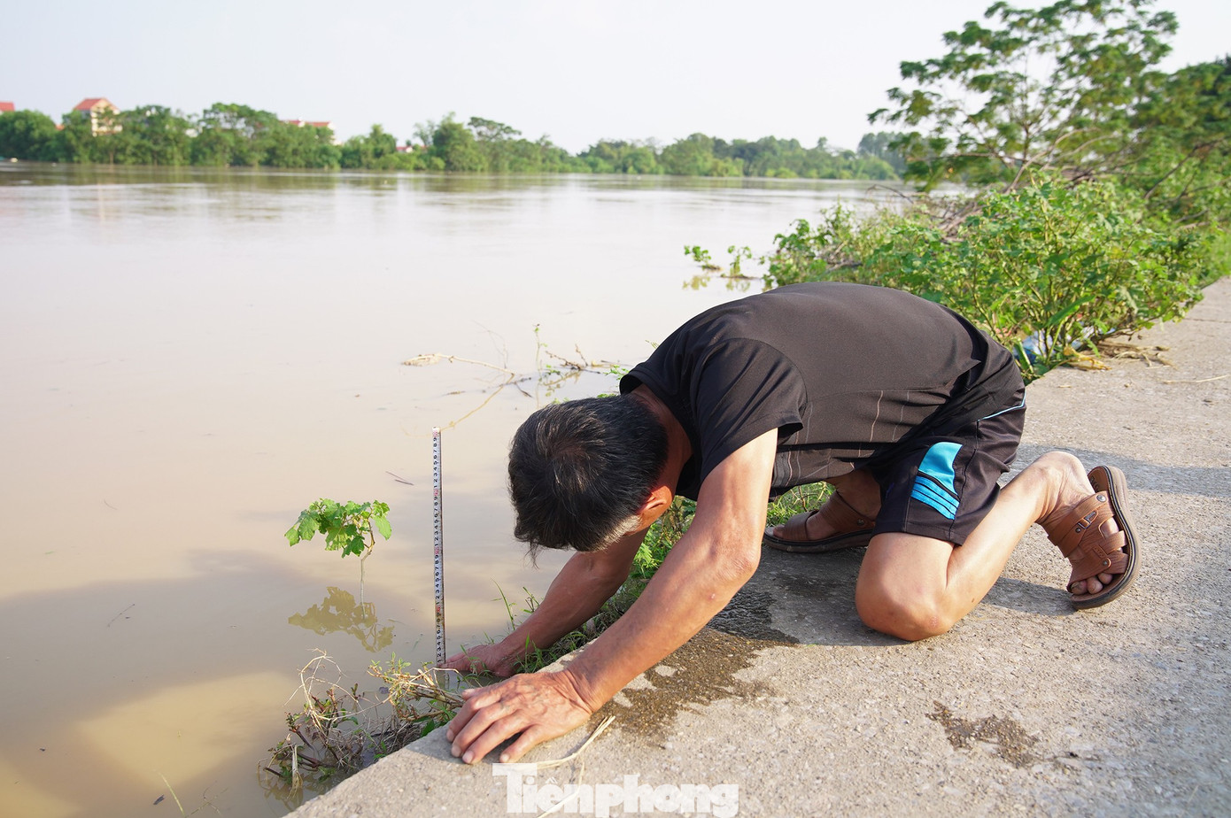 Ông Hiền (xã Đa Phúc) cho biết, ông tự cắm thước đo mực nước sông, nửa tiếng qua nước sông đã lên 1mm. "Nước sông lên khá nhanh nên mọi người đều cố gắng chủ động trong mọi tình huống", ông Hiền chia sẻ.